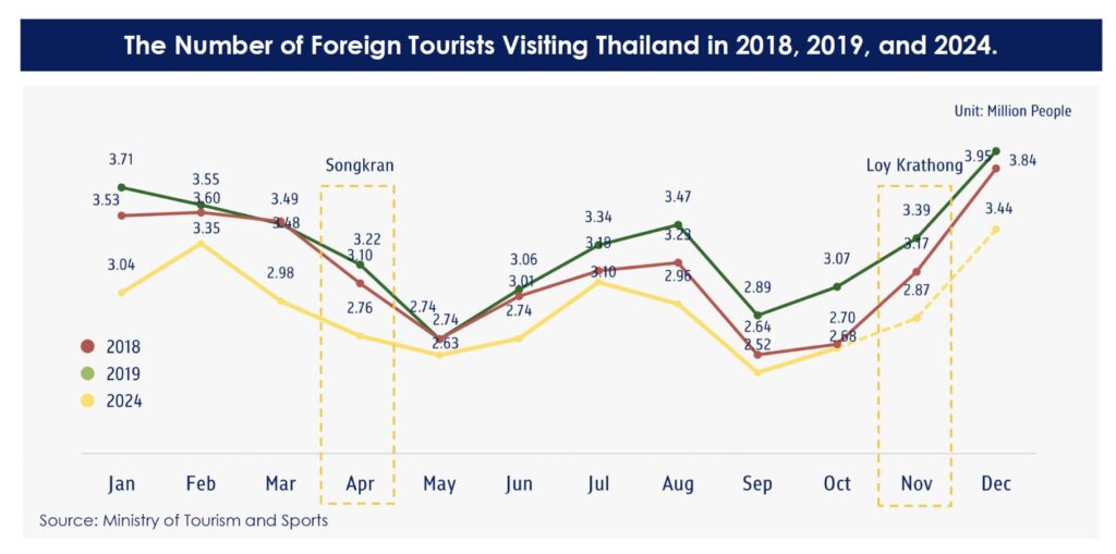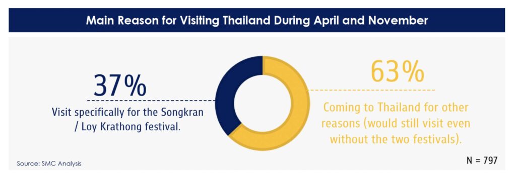 Tourism data from 2018, 2019, and 2024 (excluding pandemic-impacted years) further supports this trend, showing no significant spike in arrivals during the festival months of April (Songkran) or November (Loy Krathong). Among tourists who did visit during these times, only one-third came specifically for the festivals; the majority were motivated by general interest in Thailand as a destination.