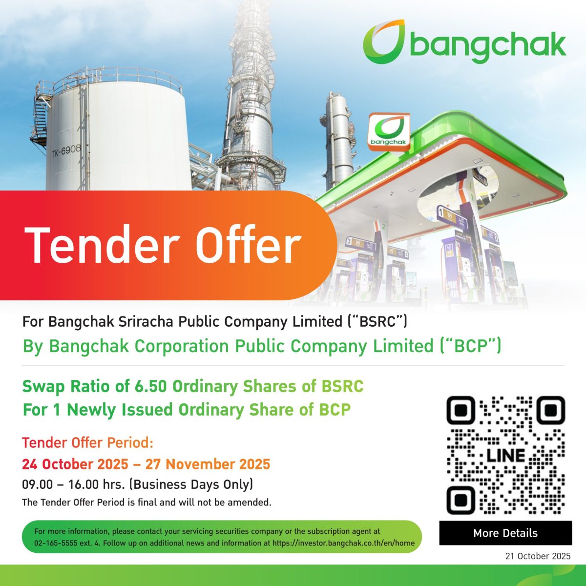 Bangchak Announces Tender Offer for BSRC Securities at 6.50 BSRC Shares per1 Newly Issued BCP Share, with the Tender Offer Period from 24 October to 27 November 2025
