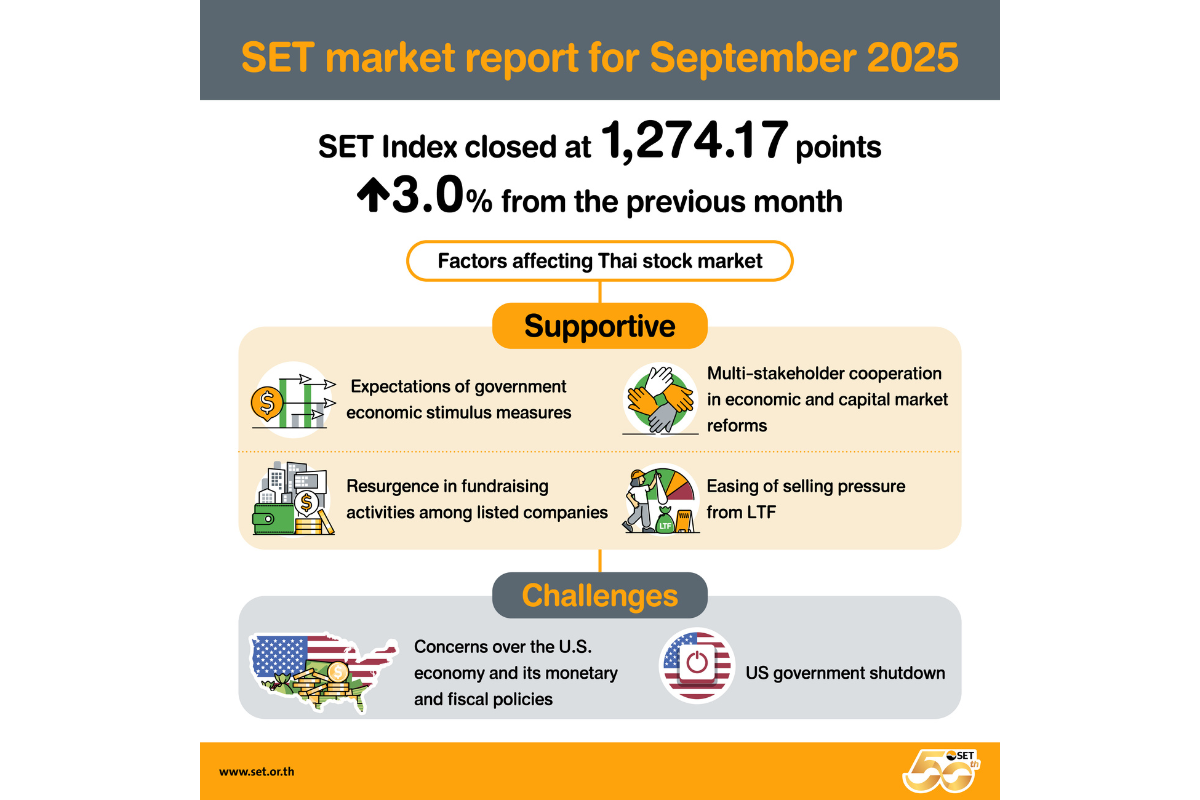 SET Senior Executive Vice President Soraphol Tulayasathien said that the U.S. government shutdown is expected to have limited impact on the SET Index, as investors largely perceive it as a temporary external factor that may create short-term volatility in capital flow. More significant factors to watch include the new government’s policy execution focused on “short-term stimulus, long-term gains, broad distribution” through the “Quick Big Win” initiative, alongside multi-stakeholder cooperation in economic and capital market reforms. The SET Index is expected to continue its recovery through the remainder of 2025, supported by a resurgence in fundraising activities among listed companies in both debt and equity markets over the past two months, while strong first-day performance of newly listed securities reflects improving investor sentiment and selling pressure from Long-term equity funds (LTF) has begun to ease.