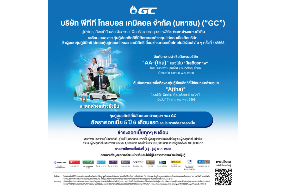 Mr. Thitipong Jurapornsiridee, Executive Vice President – Finance and Accounting at GC, said, “This issuance is part of ongoing deleveraging plan, following the strong investor response to our THB 17 billion hybrid debentures issued in 2024. It reflected the confidence investors place in GC’s and the PTT Group’s solid fundamentals. GC remains committed to financial discipline and a systematic capital management roadmap aligned with our Portfolio Transformation strategy, ensuring readiness for sustainable growth in high-value and low-carbon businesses.