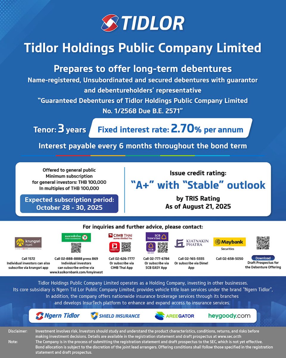 The proceeds from this issuance will be used to refinance existing corporate debt that is due for redemption within the TIDLOR Group. This will be the first debenture issuance following the Company’s corporate restructuring in May 2025, and the debenture will be fully guaranteed by Ngern Tid Lor Public Company Limited, the group’s core subsidiary. The debentures have received a credit rating of “A+” with a “Stable” outlook from TRIS Rating Co., Ltd. on August 21, 2025, reflecting the Company’s stronger financial position following the restructuring, as well as the robust performance of its key subsidiary, Ngern Tid Lor Public Company Limited, a leading provider of vehicle title loans and insurance brokerage services. Additionally, Bank of Ayudhya (BAY) is a major shareholder, further reinforcing investor confidence.
