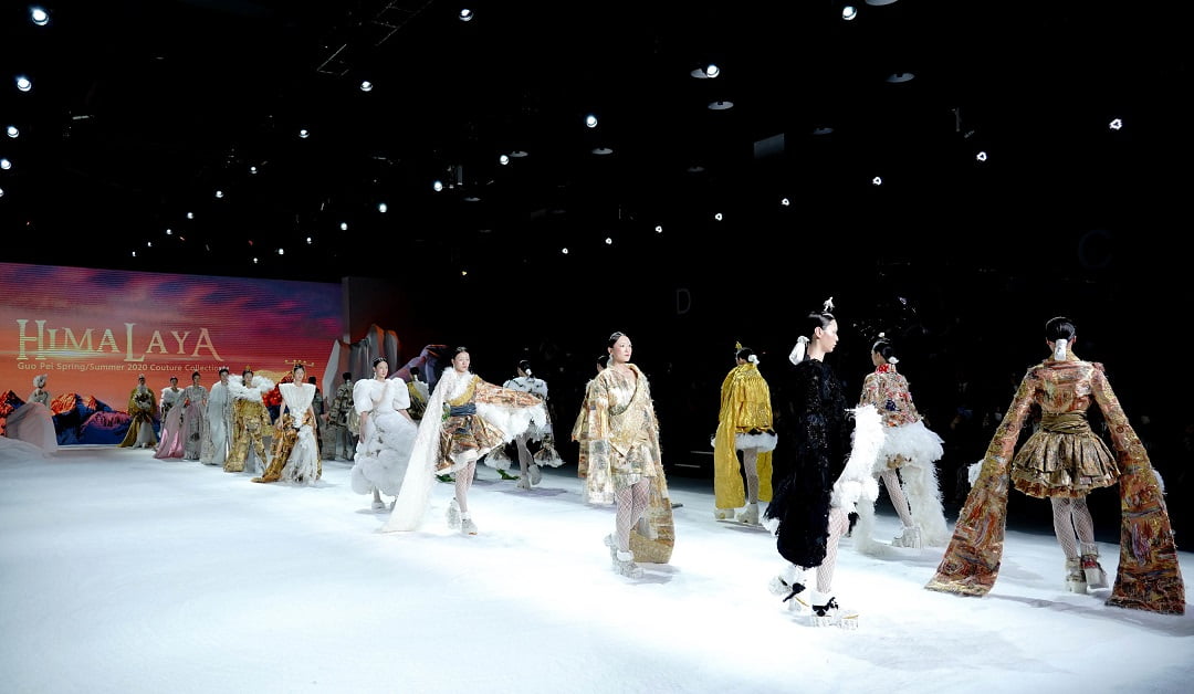 Caption: The models display the Himalaya-themed haute couture fashion works designed by the well-known fashion designer Guo Pei during the 2020 International Fashion Week on December 5