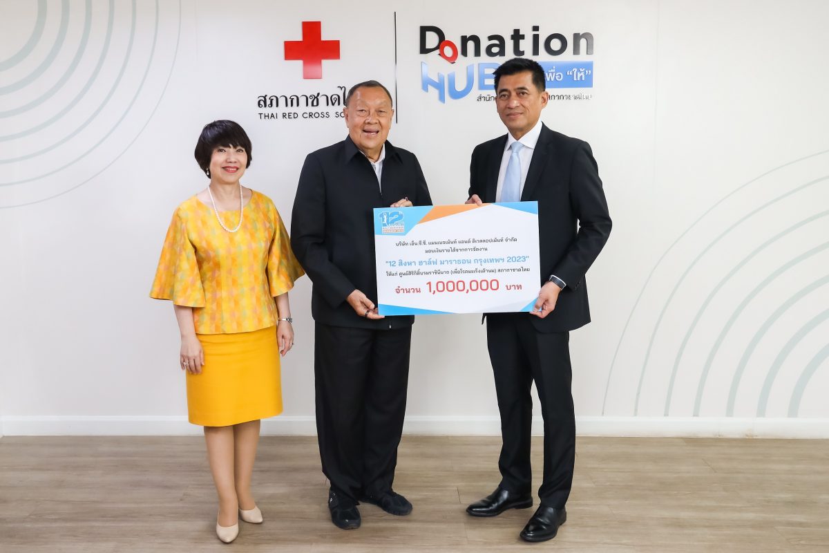 Surapol Utintu (right), Chief Executive Officer of N.C.C. Management and Development Co., Ltd., as an organizer of the 12th August Half Marathon Bangkok 2023, presented all proceeds after expense deduction of 1 million Baht to Khan Prachyabmoh (center), Director, Fund Raising Bureau, Thai Red Cross Society to support Queen Sirikit Centre for Breast Cancer (QSCBC) based at King Chulalongkorn Memorial Hospital, under the auspices of the Thai Red Criss Society. Witnessed the donation is Janprapa Vichitcholchai (left), Deputy Director, Fund Raising Bureau, Thai Red Cross Society.