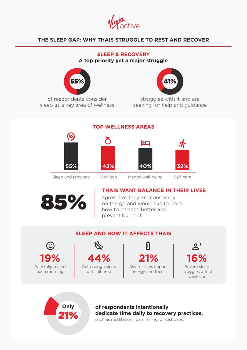The campaign highlights the growing need for balance in today’s always-on culture. According to a recent Virgin Active survey of 1,000 Thai consumers, more than half (55%) identified sleep and recovery as the most important area of wellness, followed by nutrition (42%) and mental well-being (40%). Yet despite this awareness, over two-thirds (70%) of respondents said they often feel constantly on the go and want to learn how to slow down to prevent burnout.