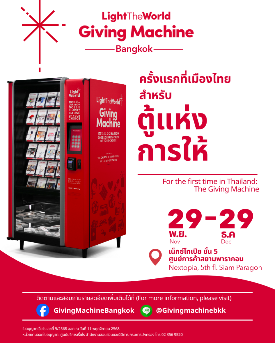 “The Thai people are well-known globally for their generosity and compassion. We are thrilled to bring the Giving Machine to Bangkok, providing a unique and highly transparent way for individuals and families to engage in the pure joy of service, knowing that every single contribution will directly uplift our communities,” said Elder Natthapol Lattisophonkul, Area Seventy of the Church in Thailand.