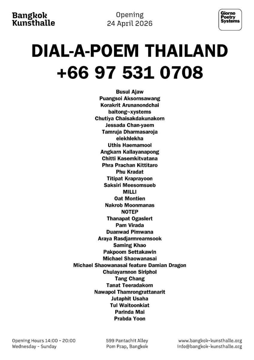 Dial-A-Poem Thailand launches on 24 April 2026 at 6pm at Bangkok Kunsthalle.