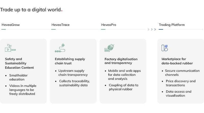 Open to all credible rubber market users, HeveaConnect solves for supply chain efficiencies, enhances bilateral trade and will next develop a multilateral trading process. Its innovations include HeveaConnect Platform, HeveaPro, HeveaTrace and HeveaGrow which tackle challenges across the supply chain. HeveaConnect promotes sustainable and auditable rubber production techniques, advocates traceable data-backed rubber, and provides superior price discovery for Sustainable Natural Rubber.