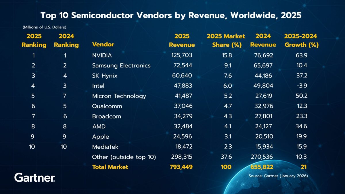 Worldwide semiconductor revenue totaled $793 billion in 2025, an increase of 21% year-over-year (YoY), according to preliminary results by Gartner, Inc., a business and technology insights company.
