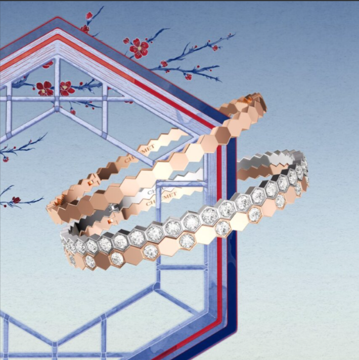 Inspired by the geometric motif of honeycomb cells, the Bee de Chaumet collection resonates with the delicate snowflake tracery of traditional hexagonal Chinese windows. Expertly crafted in mirror-polished gold that radiates a layered, luminous glow, each creation captures the tender warmth of spring light – as if gazing through an ornate lattice into a scene of festive tranquility, honoring the joyful moments of a new beginning.