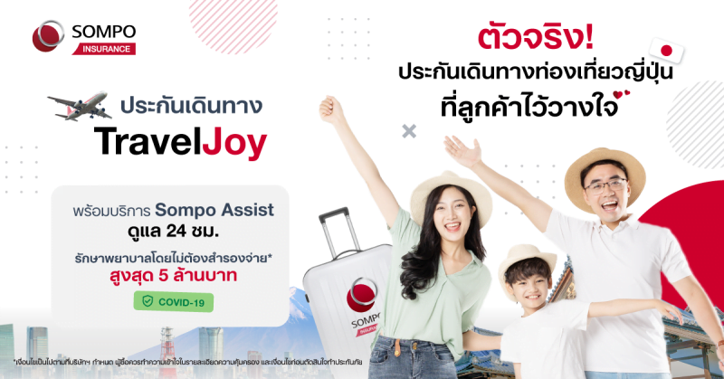 Support the confidence in making traveling abroad easy and worry-free as Sompo TravelJoy, the travel insurance from Sompo Insurance, provides worldwide coverage. Give Thai customers peace of mind when having abroad trip with care that protects both life and property from the first step out of the house on the day of travel all the way back to Thailand. If there is an unexpected happens during the trip, customers can receive treatment at the network hospitals without having an upfront payment of medical expenses* through the service of Sompo Assist (+662-205-7775).