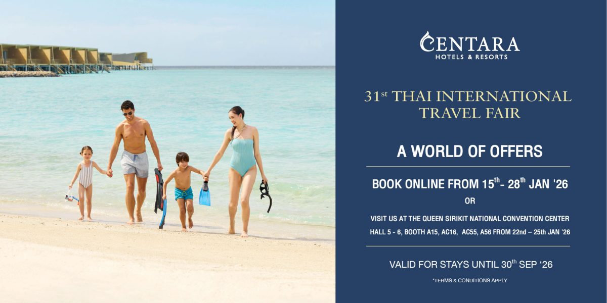 Explore captivating destinations across Thailand and overseas by visiting Centara’s booths at the Queen Sirikit National Convention Center during the fair from 22nd – 25th January 2026 at booths A15, AC16, AC55 and A56 or booking online via https://www.centarahotelsresorts.com/titf-31 from now – 28th January 2026 for stay period until 30th September 2026.