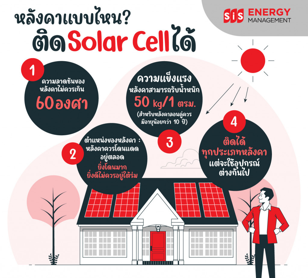 - ความลาดชันของหลังคา : ความลาดชันที่เหมาะสมสำหรับการติดตั้ง Solar Cell อยู่ที่ 15 องศา เป็นความลาดชันที่ทำให้ผลิตไฟฟ้าได้ดีที่สุด หากเพิ่มหรือลด 5 องศา จะทำให้ผลิตไฟฟ้าลดลงประมาณ 10% และหลังคาไม่ควรมีความลาดชันมากกว่า 60 องศา