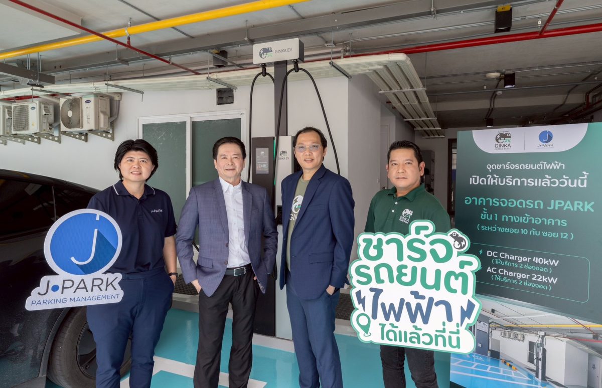 นาย สันติพล เจนวัฒนไพศาล ประธานเจ้าหน้าที่บริหาร คุณจุฑามาศ วิไลเลิศพงศ์พันธ์ประธานเจ้าหน้าที่ฝ่ายเทคโนโลยีสารสนเทศ บริษัท เจนก้องไกล จำกัด (มหาชน) “JPARK” เดินหน้าสนับสนุนการเปลี่ยนผ่านสู่ยุคพลังงานสะอาดและยานยนต์ไฟฟ้า ร่วมกับ นายณรงค์ศักดิ์ เลิศทรัพย์ทวี กรรมการผู้จัดการ บริษัท ฟอร์ท สมาร์ท เซอร์วิส จำกัด (มหาชน) เปิดให้บริการ สถานีชาร์จรถยนต์ไฟฟ้า “GINKA Charge Point” ณ โครงการ JPARK กาญจนสุข จ.นนทบุรี เพื่ออำนวยความสะดวกแก่ผู้ขับขี่รถยนต์ไฟฟ้าในย่านกรุงเทพฯ ตะวันตก และพื้นที่ปริมณฑล