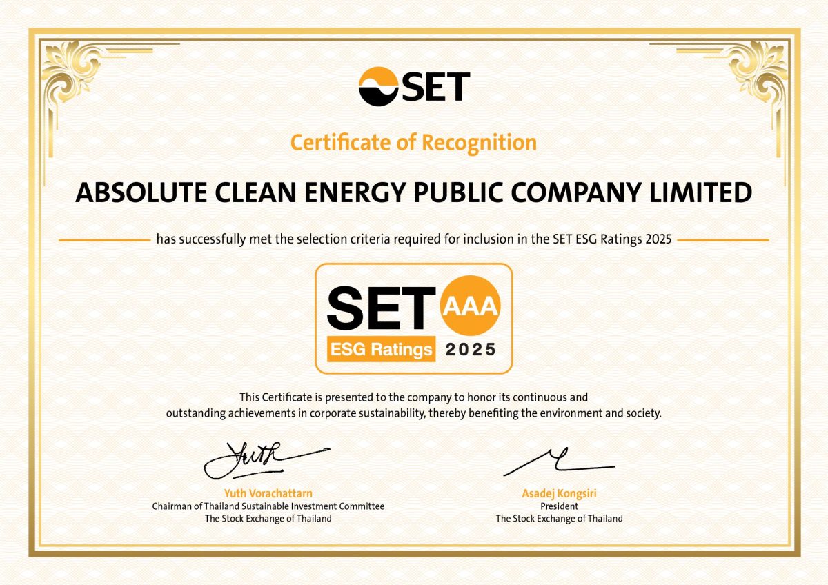 นายธนะชัย บัณฑิตวรภูมิ ประธานเจ้าหน้าที่บริหาร บริษัท แอ๊บโซลูท คลีน เอ็นเนอร์จี้ จำกัด (มหาชน) หรือ ACE ผู้นำด้านธุรกิจพลังงานสะอาดของไทย เปิดเผยว่า ACE ได้รับการประเมินหุ้นยั่งยืน SET ESG Ratings ประจำปี 2568 จากตลาดหลักทรัพย์แห่งประเทศไทยที่ระดับ “AAA” อันเป็นระดับสูงสุดของการประเมินต่อเนื่องเป็นปีที่ 2 ซึ่งปีนี้มีบริษัทจดทะเบียนที่เข้าร่วมรับการประเมิน 365 บริษัท โดย ACE เป็น 1 ใน 102 บริษัทจดทะเบียนที่ได้รับผลการประเมิน SET ESG Ratings ระดับ “AAA” (90 – 100 คะแนน) ซึ่งบริษัทฯ สมัครเข้าร่วมรับการประเมิน SET ESG Ratings ต่อเนื่องเป็นปีที่สี่ติดต่อกัน