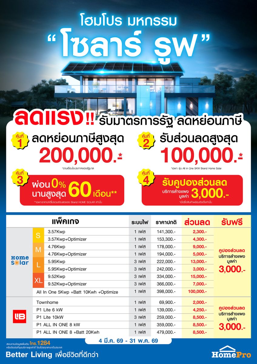 พร้อมกันนี้ โฮมโปร-เมกาโฮม ยังจัดแคมเปญพิเศษ “มหกรรม โซลาร์ รูฟ” มอบความคุ้มค่าสำหรับผู้ที่ติดตั้งระบบโซลาร์ รูฟ 4 คุ้ม คุ้มที่ 1 ลดหย่อนภาษีสูงสุด 200,000 บาท คุ้มที่ 2 รับส่วนลดสูงสุด 100,000 บาท สำหรับรุ่น All in One 5kW Brand Home Solar คุ้มที่ 3 ผ่อน 0% นานสูงสุด 60 เดือน คุ้มที่ 4 รับคูปองส่วนลดบริการล้างแผงโซลาร์มูลค่า 3,000 บาท เมื่อซื้อสินค้าและติดตั้งตามเงื่อนไข ระหว่างวันที่ 4 มีนาคม – 31 พฤษภาคม 2569