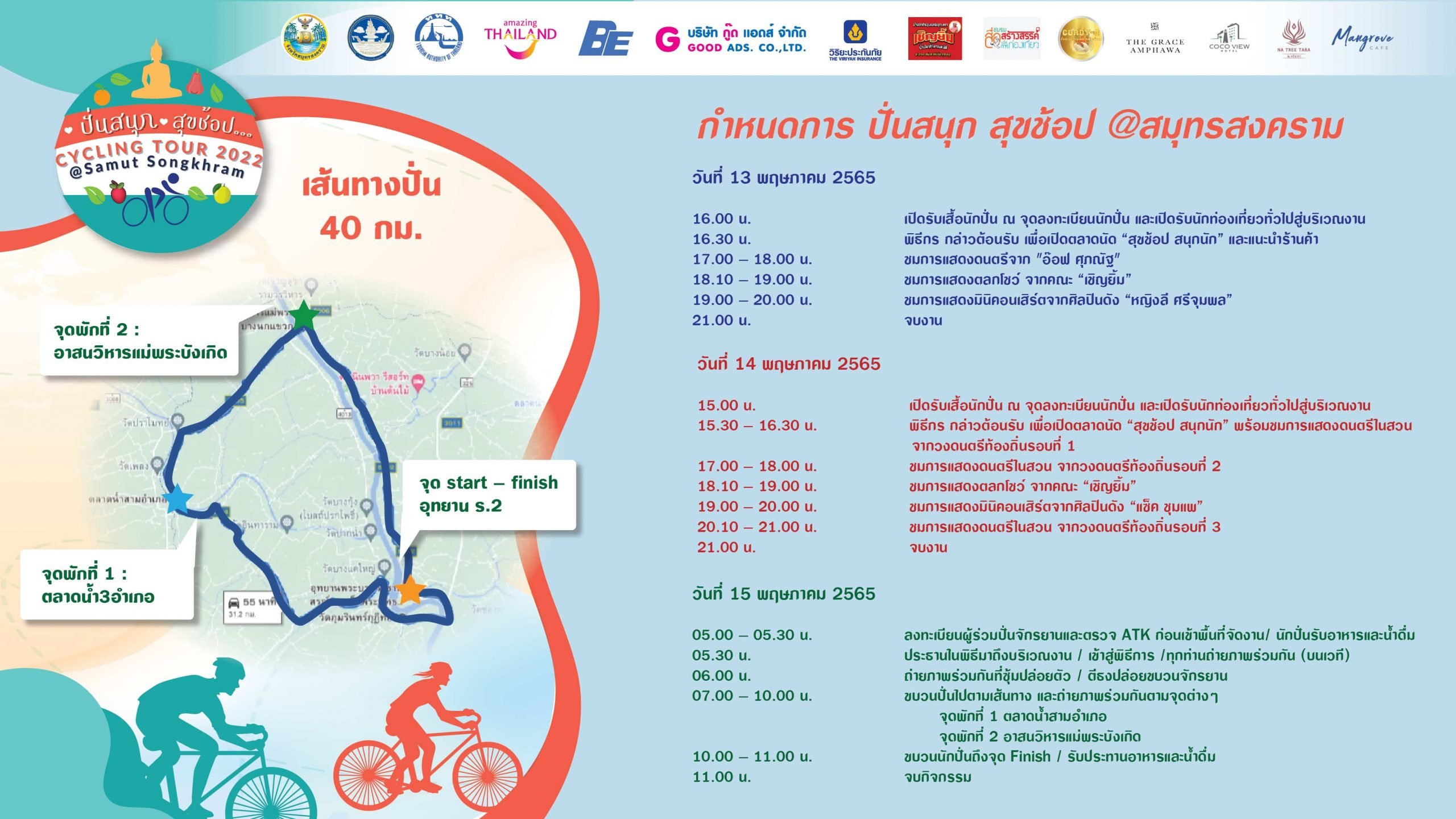 และในวันอาทิตย์ที่ 15 พฤษภาคม 2565 จะมีการจัดกิจกรรมปั่นจักยานเพื่อการท่องเที่ยว ในช่วงเช้า เส้นทาง 40 กิโลเมตร กับ 2 สาวนางฟ้านักปั่น หวานหวาน อรุณภา และกอล์ฟ สุรัมภา โดยมีจุดสตาร์ตที่ อุทยานพระบรมราชานุสรณ์ พระบาทสมเด็จพระพุทธเลิศหล้านภาลัย (อุทยาน ร. ๒) หลังจากนั้น ปั่นไปเที่ยวที่จุดบริเวณพักที่ 1 ณ ตลาดน้ำสามอำเภอ และจุดพักบริเวณที่ 2 ณ.อาสนวิหารแม่พระบังเกิดหลังจากนั้นปั่นกลับมาที่จุดสตาร์ต โดยมีการแจกอาหาร น้ำดื่ม และของว่างกับนักปั่นฟรี พร้อมทั้งการจัดกิจกรรมล่องเรือไหว้พระ 5 วัดให้แก่ผู้เข้าร่วมกิจกรรม โดยผู้ที่เข้าร่วมงานนี้จะต้องผ่านการฉีดวัคซีนอย่างน้อย 2 เข็ม และร่วมมือปฎิบัติตามกฎมาตรการรักษาความปลอดภัยจากโควิดของผู้จัดงานอย่างเคร่งครัด