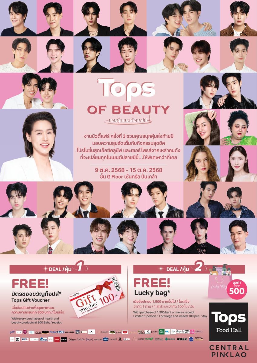 ท็อปส์ ธุรกิจกลุ่มฟู้ด ในเครือเซ็นทรัล รีเทล จัดงาน ‘TOPS of Beauty’ ชวนขาช้อปและสายบิวตี้มาช้อปสุดคุ้มกับหลากหลายสินค้าบิวตี้ไอเทมแบรนด์ดัง พร้อมเสิร์ฟความฟินกับกิจกรรมสุดเอ็กซ์คลูซีฟจากเหล่าศิลปิน ดารา และบิวตี้อินฟลูเอนเซอร์ชื่อดังแบบใกล้ชิด นำโดยซูเปอร์สตาร์สุดฮอตอย่าง บิวกิ้น พุฒิพงศ์, นางเอกขวัญใจมหาชน เบลล่า ราณี, นักร้องสาวเสียงดี วีโอเลต วอเทียร์ และยังมีทัพนักแสดงอีกมากมายที่จะแวะเวียนมาสร้างสีสัน อาทิ โทมัส ธีร์ทัศน์ , เฟิร์ส คณพันธ์, นนน กรภัทร์, เติ้ล มติมันท์ & เฟิร์สวัน วรรณกร , นิว ชยภัค , แซนต้า พงศภัค , ซี พฤกษ์ – นุนิว ชวรินทร์ , จูเนียร์ ปณชัย , เก่ง หฤษฎ์ – น้ำปิง นภัสกร ฯลฯ