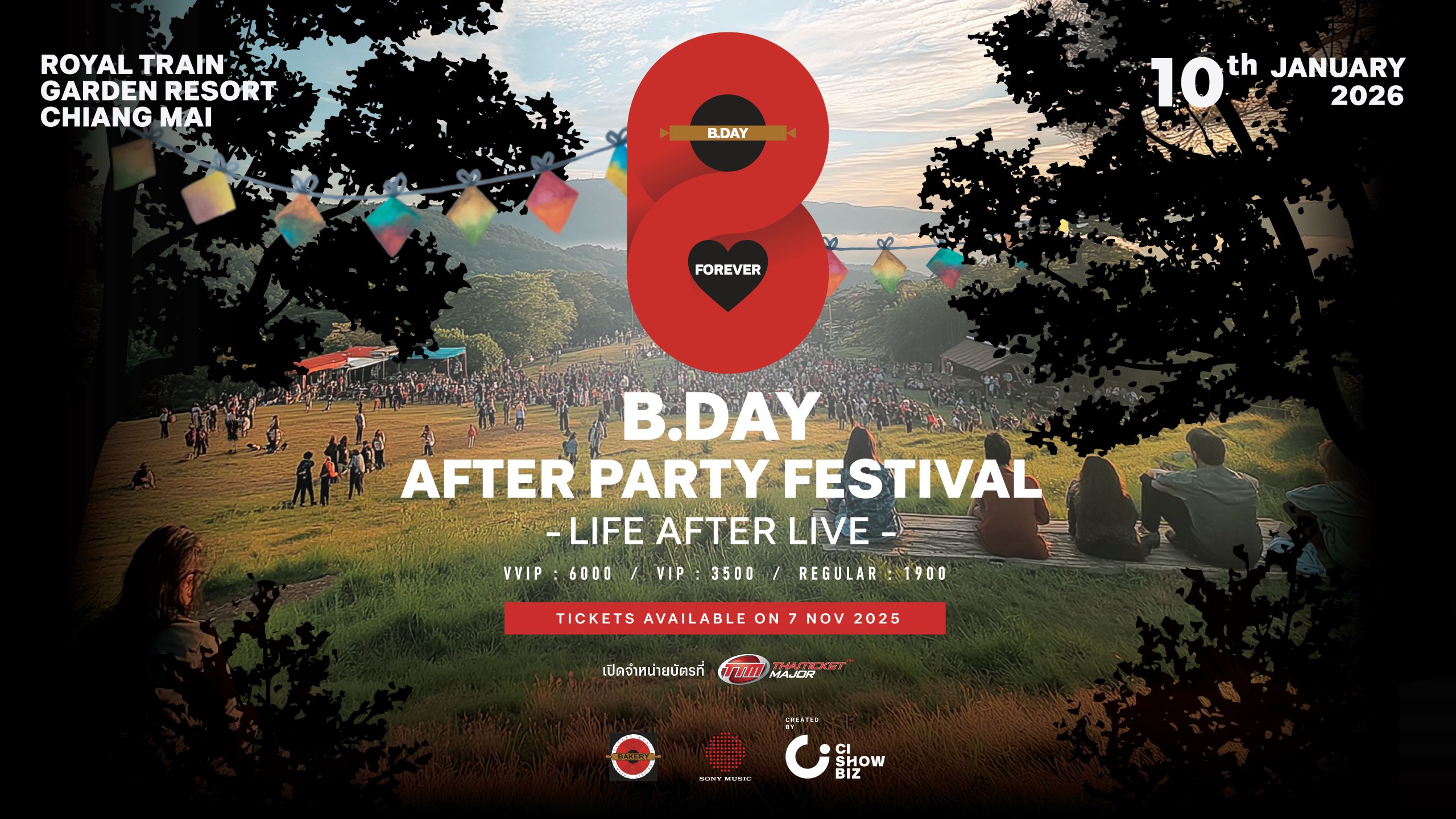 หลังจากบัตรคอนเสิร์ตใหญ่ “B.DAY Forever Concert” (5–8 ธันวาคม 2568 ณ อิมแพ็ค อารีน่า เมืองทองธานี) ถูกจำหน่ายหมดทุกที่นั่งภายในเวลาเพียง 10 นาที กระแสตอบรับจากแฟนเพลงยังคงล้นหลาม หลายคนพลาดโอกาสการเป็นส่วนหนึ่งของประสบการณ์ครั้งสำคัญ ขณะเดียวกันศิลปินก็อยากมีเวลาโชว์เต็มอิ่ม เพื่อตอบสนองทั้งแฟนเพลงและศิลปิน สามบอสแห่ง Bakery Music นำทีมโดย สุกี้–กมล สุโกศล แคลปป์, บอย–โกสิยพงษ์ และสมเกียรติ อริยะชัยพาณิชย์ ผู้บุกเบิกค่ายเพลงทันสมัยแนวเพลงอินดี้ ที่มาเปลี่ยนวิธีฟังเพลงไทยไปตลอดกาล และ Dojo City ค่ายเพลงป็อปแดนซ์สีสันสดใส ร่วมกับ ผู้จัด CI Showbiz สานต่อความสุขและพลังของเสียงดนตรี รวมพลศิลปินไปต่อที่เชียงใหม่ “B.DAY After Party Festival: Life After Live” งานดนตรีกลางแจ้งครั้งยิ่งใหญ่ที่แฟนเพลงไม่ควรพลาด ในวันเสาร์ที่ 10 มกราคม 2569 ณ บ้านสวนรถไฟรีสอร์ท (Royal Train Garden Resort) อำเภอหางดง จังหวัดเชียงใหม่ งานนี้จะพาแฟนเพลงออกเดินทางสู่ภาคเหนือ ท่ามกลางอากาศเย็นสบายและบรรยากาศเป็นกันเอง ให้ทุกคนได้เก็บเกี่ยวความสุข สร้างความทรงจำใหม่ และดื่มด่ำไปกับเสียงเพลงอีกครั้ง