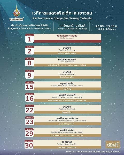 เวทีการแสดงเพื่อเด็กและเยาวชน นิทรรศน์รัตนโกสินทร์ เดือนพฤศจิกายน พบกับการแสดงอัตลักษณ์ความงดงามของศิลปะไทย ถ่ายทอดด้วยหัวใจแห่งความภักดี และความภาคภูมิใจให้คงอยู่คู่ผืนแผ่นดิน อาทิ ขับร้องประสานเสียง เพลง สายน้ำของแผ่นดิน โดย วง The Dynamics ชมรม VoiZe Academy Thailand โขน เรื่อง รามเกียรติ์ ชุด พาลีสอนน้อง หนุมานอาสา พระรามข้ามสมุทร โดย กลุ่มเพ้ยฮีโร่ กลุ่มอนุรักษ์วัฒนธรรมไทย โรงเรียนวัดสิตาราม โรงเรียนนาฏศิลป์ขาบมงคล และบรรเลงเดี่ยวขิมหมู่ เพลง สาลิกาชมเดือน สามชั้น โดย บ้านดนตรีสมบูรณ์ศิลป์ ชมฟรี ทุกวันเสาร์ – อาทิตย์ เวลา 12.00 – 13.30 นาฬิกา สอบถามเพิ่มเติม โทร. 09 5476 5868