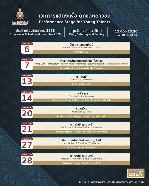 เนื่องในวันคล้ายวันพระบรมราชสมภพพระบาทสมเด็จพระบรมชนกาธิเบศร มหาภูมิพลอดุลยเดชมหาราช บรมนาถบพิตร 5 ธันวาคม 2568 เวทีการแสดงเพื่อเด็กและเยาวชน นิทรรศน์รัตนโกสินทร์ เดือนธันวาคม พบกับการแสดงขับร้อง ชุด เพลงรักจากโครงการพระราชดำริ / จินตลีลา ชุด เดินตามรอยเท้าพ่อ โดย สถาบันวิชาไทย การแสดงจินตลีลา เพลง ในดวงใจนิรันดร์ โดย บ้านรำไทยดอนเมือง การแสดงพื้นบ้านภาคอีสาน (โปงลาง) โดย สมาคมศิลปะเพื่อเยาวชน กรมส่งเสริมวัฒนธรรม และการแสดงศิลปะป้องกันตัว กระบี่กระบอง โดย โรงเรียนธนบุรีวรเทพีพลารักษ์ ชมฟรี ทุกวันเสาร์ – อาทิตย์ เวลา 12.00 – 13.30 นาฬิกา สอบถามเพิ่มเติม โทร. 09 5476 5868