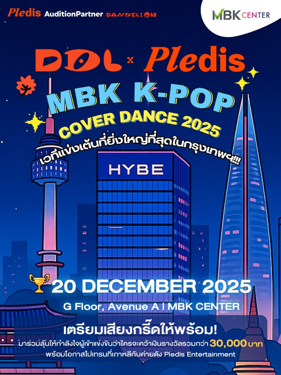 สาวก K-POP คนที่หลงรักการเต้นโคฟเวอร์สไตล์เกาหลี งานนี้ห้ามพลาด! ศูนย์การค้าเอ็ม บี เค เซ็นเตอร์ ผนึกกำลังสถาบันพัฒนาศักยภาพด้านการแสดงและบันเทิงสำหรับเยาวชน Dandelion By AuditionPartner และ ค่ายเพลงระดับโลกจากเกาหลีใต้ Pledis Entertainment จัดงานแข่งเต้นที่ยิ่งใหญ่แห่งปี “DDL x PLEDIS x MBK K-POP COVER DANCE 2025” พร้อมมอบความมันส์สุดเหวี่ยงกับรอบ Final เปิดเวทีให้เด็กและเยาวชนอายุไม่เกิน 18 ปีได้แสดงความสามารถในการเต้นโคฟเวอร์เพลง K-POP พร้อมโอกาสเทรนที่ประเทศเกาหลีใต้กับค่ายดังระดับโลก Pledis Entertainment และ เงินรางวัลรวมมูลค่ากว่า 30,000 บาท มาร่วมชมการแข่งขันเต้นโคฟเวอร์สุดเดือด ลีลาท่าเต้นที่จะทำให้คุณต้องร้องว้าว!! ร่วมเชียร์นักเต้นรุ่นใหม่ เยาวชนไทยก้าวสู่ความฝันในการเป็นไอดอล K-POP ในวันเสาร์ที่ 20 ธันวาคม 2568 ตั้งแต่ 11.00 น. – 19.00 น. ชมฟรี!! ณ ลานกิจกรรมเอ็ม บี เค อเวนิว โซน A