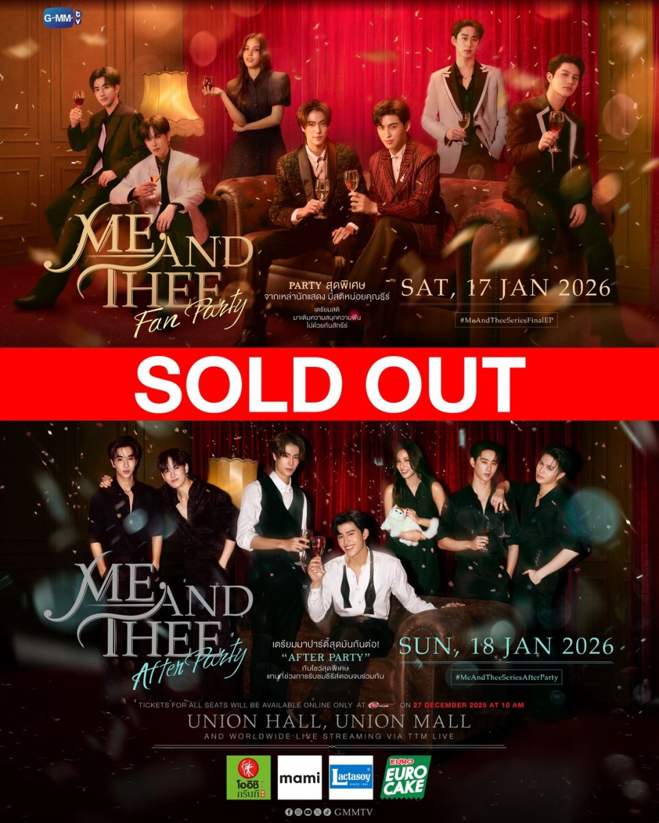 กลายเป็นกระแสร้อนแรงส่งท้ายปีที่ไม่มีใครหยุดได้จริงๆ สำหรับซีรีส์สุดฮอต “มีสติหน่อยคุณธีร์ Me and Thee” จาก “GMMTV” คอนเทนต์โพรไวเดอร์ชั้นนำของเมืองไทย หลังจากเปิดจำหน่ายบัตรงาน “Me and Thee Fan Party” และ “Me and Thee After Party” ได้ไม่นานปรากฏว่าพลังความรักของแฟนๆ ถล่มทลาย จนสร้างสถิติบัตรทุกที่นั่ง ทุกราคา ถูกจับจองเต็มทุกพื้นที่ภายในเวลาอันรวดเร็วทั้ง 2 รอบการแสดง ซึ่งสำหรับแฟนๆ ที่มีบัตรอยู่ในมือ เตรียมตัวพบกับความเอ็กซ์คลูซีฟแบบจัดเต็มกับโชว์สุดเซอร์ไพรส์ และโมเมนต์ความฟินที่หาจากไหนไม่ได้จากเหล่านักแสดงนำอย่าง “ปอนด์ ณราวิชญ์ เลิศรัตน์โกสุมภ์” กับ “ภูวินทร์ ตั้งศักดิ์ยืน” พร้อมด้วย“วิลเลี่ยม จักรภัทร แก้วพันธุ์พงษ์, เอส ศุภ สง่าวรวงศ์, บอนนี่ ภัทราภัสร์ โบรัชตะสุวรรณ์, เพิร์ธ ธนพนธ์ สุขุมพันธนาสาร, แซนต้า พงศภัค อุดมโภชน์ และผู้กำกับฯ คนเก่ง “เอ็กซ์ ณัฐพงษ์ มงคลสวัสดิ์ ใน วันเสาร์ที่ 17 มกราคม 2569 และ วันอาทิตย์ที่ 18 มกราคม 2569 เวลา 19.00 น. ณ ยูเนี่ยน ฮอลล์ ชั้น F6 ศูนย์การค้ายูเนี่ยน มอลล์ เตรียมร่างกายและหัวใจให้พร้อม แล้วไปพิสูจน์พร้อมกันว่า “สติ” อาจไม่มีอยู่จริงในงานที่ฟินที่สุดแห่งปี