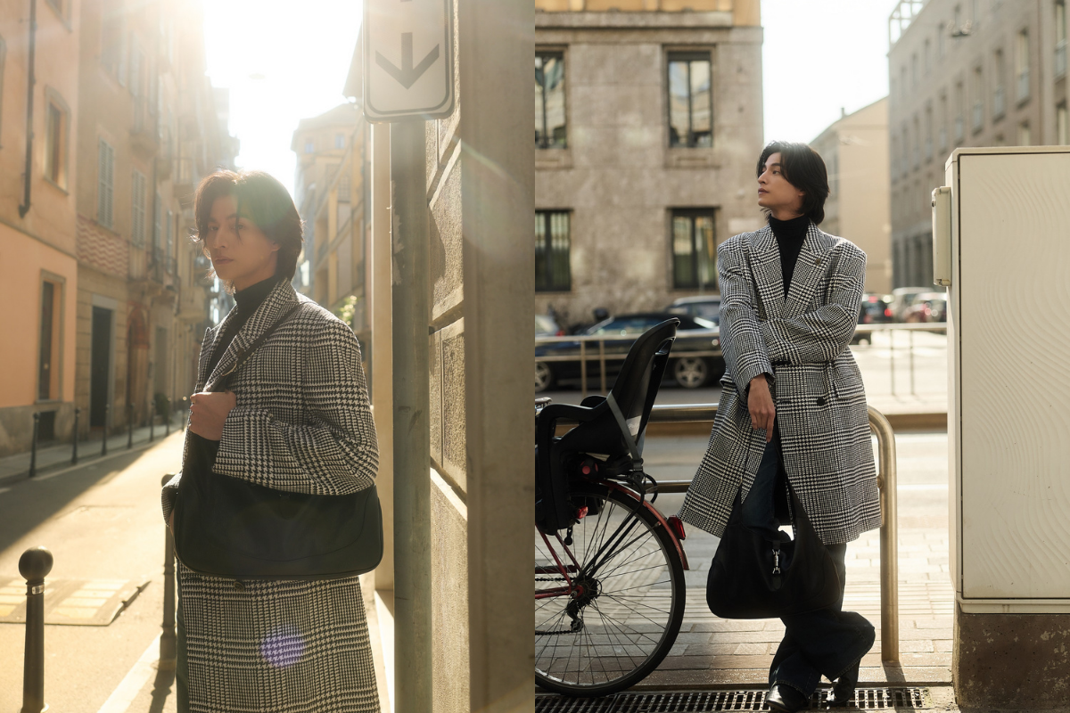 “กลัฟ – คณาวุฒิ” ถ่ายทอดเสน่ห์สุดอบอุ่นในแบบฉบับหนุ่ม Gucci ท่ามกลางไวบ์แสงแดดละมุนของมิลาน ผ่านลุค Cocco di Mamma จากคอลเล็กชั่น La Famiglia ด้วยเสื้อแขนยาวคอเต่าสีดำ จับคู่กางเกงผ้าฝ้ายเดนิมฟอกสีตกแต่งด้วยสัญลักษณ์ Horsebit พร้อมด้วยเสื้อโค้ทผ้าวูลลาย Prince of Wales สีขาว–ดำ ประดับด้วยเข็มกลัด Gucci Crest คอมพลีทลุคด้วยกระเป๋า รุ่น Jackie 1961 และรองเท้า Horsebit Loafer หนังสีดำ