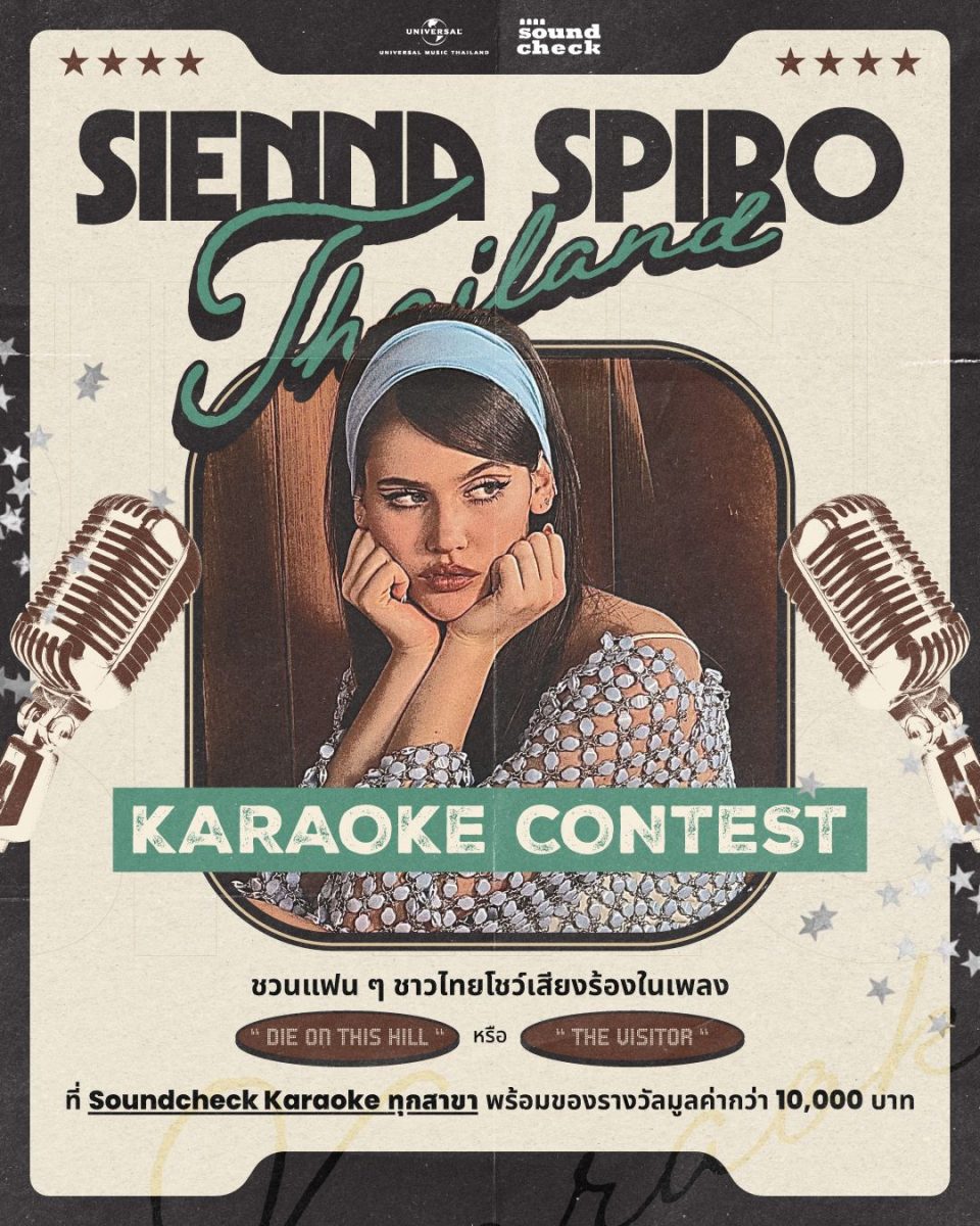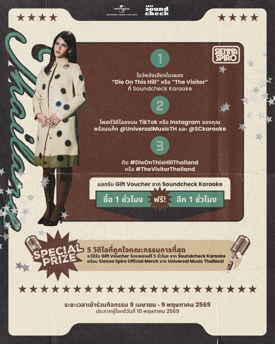 ถึงเวลาโชว์เสียงร้องของคุณให้ดังไกลถึงต่างประเทศแล้ว! ไม่ว่าคุณจะชื่นชอบเพลงฮิตของ SIENNA SPIRO อย่าง “Die On This Hill” เพลงโชว์พลังโวคอลของทุกเวทีประกวดร้องเพลง หรือจะเป็นเพลง “The Visitor” ที่มาพร้อมน้ำเสียงบาดลึก ไวรัลมาแรงไม่แพ้กัน ก็สามารถเลือกร้องคาราโอเกะเพลงเหล่านี้ ที่ Soundcheck Karaoke ได้ทุกสาขา พร้อมรับของรางวัลสุดพิเศษจาก Universal Music Thailand และ Soundcheck Karaoke โดยมีสิทธิ์รับรางวัลสุดพิเศษได้ถึง 2 ต่อ!