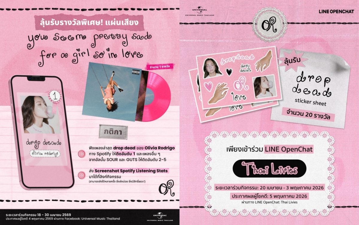 งานจบแล้ว แต่แฟน ๆ ยังลุ้นของรางวัลกันต่อได้อีกถึง 2 กิจกรรม ลุ้นรับแผ่นไวนิลของ Olivia Rodrigo อัลบั้ม you seem pretty sad for a girl so in love จำนวน 1 รางวัล เพียงแค่ฟังเพลง “drop dead” ใน Spotify ฟังบ่อย ๆ จนติด Spotify Listening Stats อันดับ 1 แล้วมีเพลงอื่น ๆ ของ Olivia Rodrigo จากอัลบั้ม SOUR และ GUTS อยู่ในอันดับที่ 2-5 กด screencapture หน้าจอ แล้วส่งภาพมาในลิงก์กิจกรรมใน Facebook และ Instagram ของ Universal Music Thailand สามารถร่วมสนุกได้ตั้งแต่วันนี้-30 เมษายนนี้