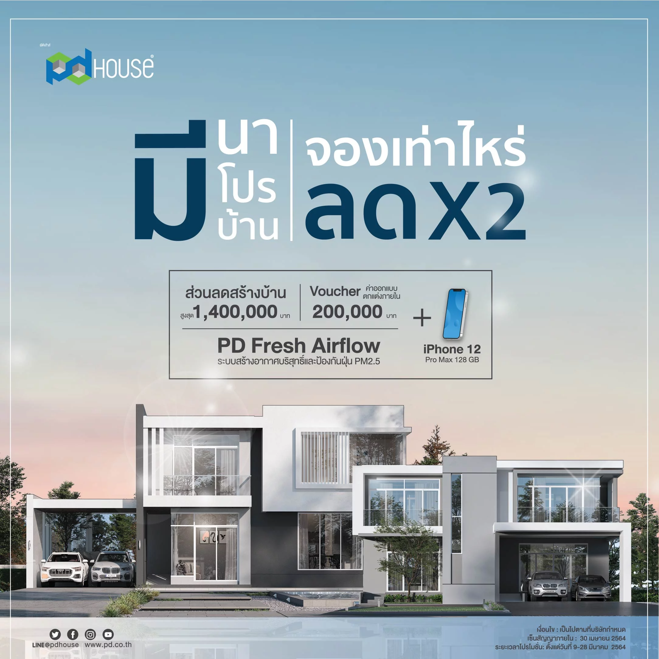 “เพื่อกระตุ้นกำลังซื้อในช่วงโค้งสุดท้ายของไตรมาสนี้ ได้จัดโปรโมชั่น “มีนา มีโปร มีบ้าน” โปรเดียวครบ จบ คุ้ม โดยที่คุณไม่ต้องเดินทางมางานอีเว้นท์ แต่เราจะไปหาคุณถึงที่ มอบโปรโมชั่น 4 ต่อ 1.)จองเท่าไหร่ลดคูณสอง 2.)ส่วนลดสร้างบ้านสูงสุดกว่า 1,400,000 บาท 3.)ฟรี Voucher ค่าออกแบบตกแต่งภายในสูงสุด 200,000 บาท 4.)ฟรี iPhone 12 Pro Max 128 GB ภายในวันที่ 28 มีนาคม 2564 พร้อมกันนี้ยังได้รับสินเชื่อบ้านอัตราดอกเบี้ยพิเศษจากธนาคารอาคารสงเคราะห์ และเพื่อคุณภาพชีวิตที่ดีภายในบ้านของคุณและครอบครัว บ้านทุกหลังของพีดีเฮ้าส์จะติดตั้ง PD Fresh Airflow ระบบสร้างอากาศบริสุทธิ์และป้องกันฝุ่น PM 2.5 เทคโนโลยีเพื่อสุขภาพ ที่เราคัดสรรมาเพื่อลูกค้าของศูนย์รับสร้างบ้านพีดีเฮ้าส์เท่านั้น”