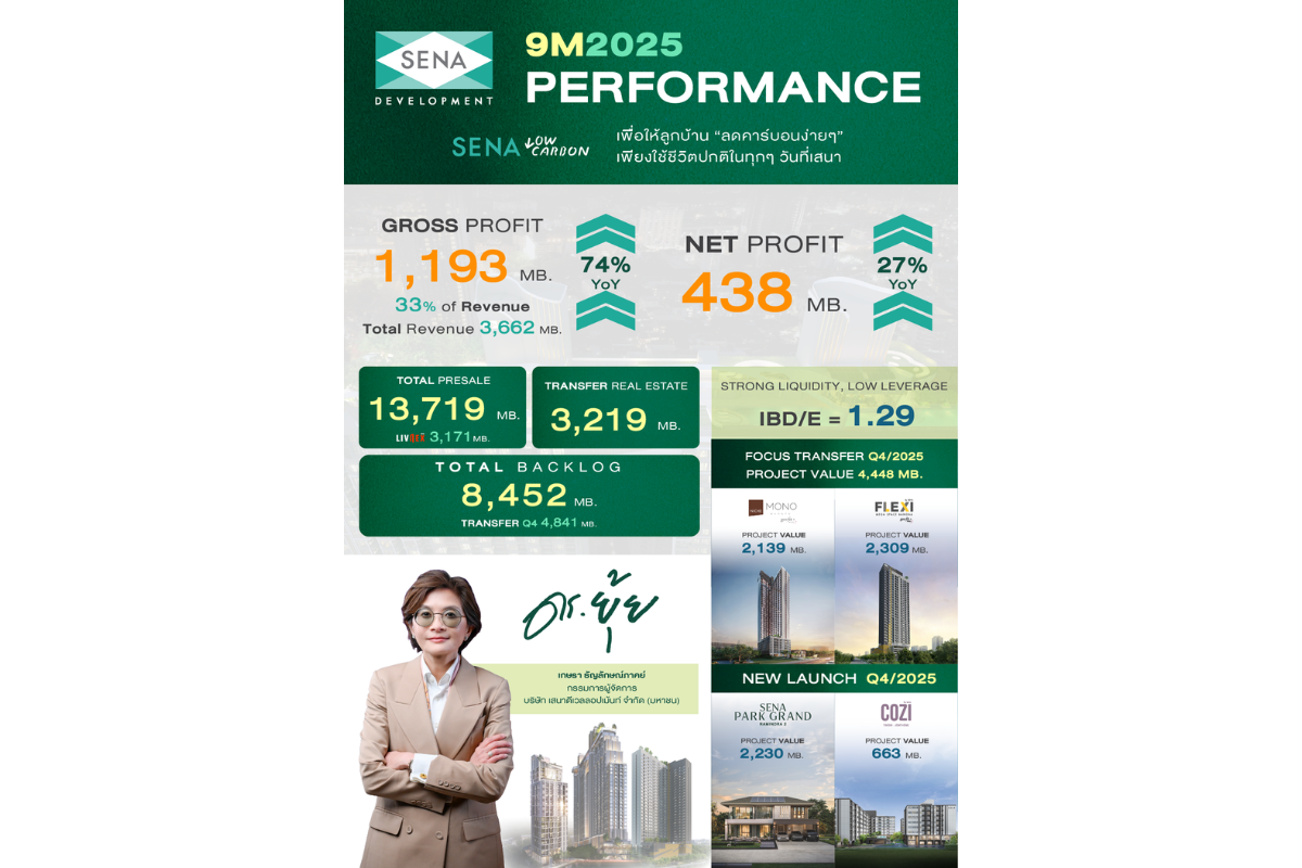บริษัท เสนาดีเวลลอปเม้นท์ จำกัด (มหาชน) หรือ SENA เผยผลประกอบการ 9 เดือนของปี 2568 มีรายได้รวม 3,662 ล้านบาท และกำไรสุทธิ 438 ล้านบาท คิดเป็น 12% ของรายได้รวม สะท้อนประสิทธิภาพการบริหารจัดการที่มั่นคงและมีวินัยทางการเงินสูง แม้ภาพรวมตลาดอสังหาริมทรัพย์ไทยยังเผชิญแรงกดดันจากภาวะหนี้ครัวเรือนและกำลังซื้อที่ฟื้นตัวช้า บริษัทสามารถรักษาสถานะทางการเงินที่แข็งแกร่งไว้ได้ โดยมีสภาพคล่องสูง กระแสเงินสดมั่นคง และ อัตราส่วนหนี้สินต่อทุน (IBD/E) 1.29 เท่า และ ณ สิ้นไตรมาส 3 บริษัทมียอดรอรับรู้รายได้ (Backlog) ประมาณ 8,452 ล้านบาท ซึ่งจะทยอยรับรู้รายได้ต่อเนื่องในปีนี้และปีถัดไป สนับสนุนการเติบโตของรายได้อย่างมั่นคง พร้อมเดินหน้าขยายพอร์ตโครงการพลังงานสะอาด เปิดตัว 3 โครงการใหม่พร้อมอยู่ รวมมูลค่ากว่า 6,678 ล้านบาท ได้แก่ “เฟล็กซี่ เมกะ สเปซ บางนา” คอนโดโลว์คาร์บอนแฟล็กชิปบนทำเลเศรษฐกิจใหม่ย่านบางนา “นิชโมโน บางโพ” คอนโดมิเนียม ทำเลศักยภาพริมแม่น้ำเจ้าพระยา และ “เสนา พาร์ค แกรนด์ 2 รามอินทรา” บ้านเดี่ยวระดับพรีเมียมติดโซลาร์พร้อมแบตเตอรี่ทุกหลัง ซึ่งจะช่วยเสริมการเติบโตของรายได้ และตอกย้ำบทบาทของเสนาในฐานะผู้นำการอยู่อาศัยอย่างยั่งยืน (SENA Sustainable Living Leader)