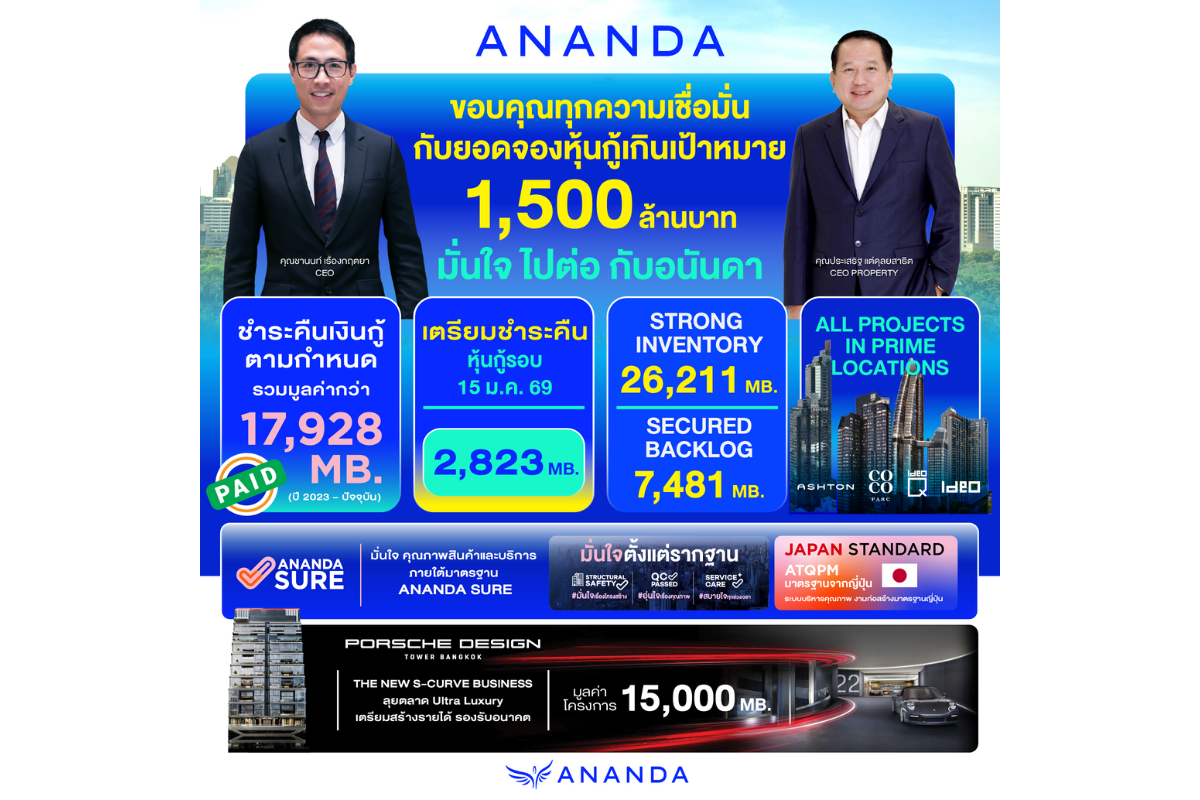 บริษัท อนันดา ดีเวลลอปเม้นท์ จำกัด (มหาชน) หรือ ANAN ผู้นำแห่งวงการพัฒนาที่อยู่อาศัยสำหรับคนเมือง ครองตำแหน่งผู้นำตลาดคอนโดมิเนียมติดรถไฟฟ้า ประกาศความสำเร็จของการออกและเสนอขายหุ้นกู้ชุดใหม่ จำนวน 2 ชุด อายุ 1 ปี 9 เดือน อัตราดอกเบี้ย 6.90% ต่อปี และอายุ 2 ปี 3 เดือน อัตราดอกเบี้ย 7.20% ต่อปี จ่ายดอกเบี้ยทุก 3 เดือน โดยเสนอขายแก่ผู้ลงทุนสถาบัน และ/หรือ ผู้ลงทุนรายใหญ่ ซึ่งได้รับการตอบรับเป็นอย่างดี มียอดจองซื้อจำนวนมากกว่า 1,500 ล้านบาท สะท้อนถึงความเชื่อมั่นของนักลงทุนต่อศักยภาพธุรกิจและเสถียรภาพทางการเงินของบริษัทฯ และแนวโน้มการเติบโตของที่อยู่อาศัยแนวรถไฟฟ้าที่มีดีมานด์ต่อเนื่อง โดยเฉพาะโครงการที่สร้างเสร็จพร้อมอยู่ ซึ่งตอบโจทย์ไลฟ์สไตล์คนเมืองยุคใหม่ได้เป็นอย่างดี