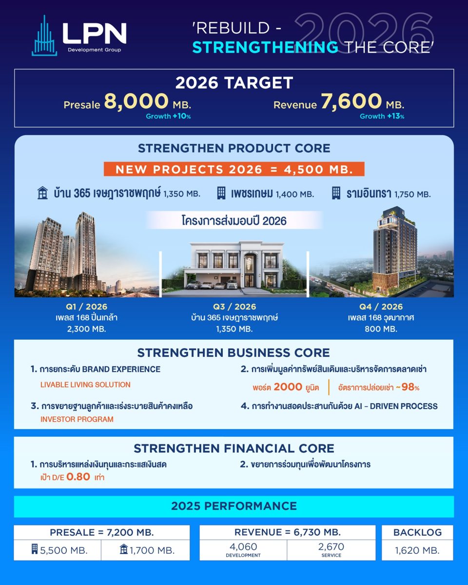 สำหรับแนวทางในการดำเนินธุรกิจของ LPN ในปี 2569 จะถือเป็นปีแห่งการรักษาเสถียรภาพและเพิ่มความยืดหยุ่นในการดำเนินธุรกิจเพื่อยกระดับศักยภาพการแข่งขันขององค์กรและสร้างความยั่งยืนในระยะยาว ภายใต้กลยุทธ์ “Rebuild – Strengthening The Core” ประกอบด้วย 3 แกนหลัก ได้แก่