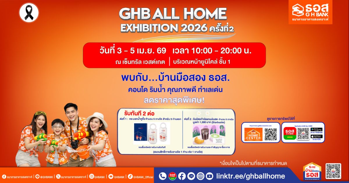 ธนาคารอาคารสงเคราะห์ (ธอส.) เดินหน้ากระตุ้นตลาดอสังหาริมทรัพย์ปี 2569 จัดโรดโชว์มหกรรมบ้านมือสอง GHB ALL HOME EXHIBITION 2026 ครั้งที่ 2 ระหว่างวันที่ 3 – 5 เมษายน 2569 เวลา 10.00 – 20.00 น. ณ เซ็นทรัล เวสต์เกต คัดสรรทรัพย์เด่น ทำเลดีทั่วประเทศ มาจำหน่ายในราคาคุ้มค่า พร้อมโปรโมชันพิเศษ เพื่อเพิ่มโอกาสให้ประชาชนมีที่อยู่อาศัยได้ง่ายขึ้น พิเศษ! 2 ต่อ ต่อที่ 1 ผู้ที่จองซื้อทรัพย์ภายในงาน 5 ท่านแรก รับทันทีกระบอกน้ำหูหิ้ว และต่อที่ 2 ผู้ที่จองซื้อทรัพย์ภายในงานและทำสัญญาจะซื้อจะขาย รับบัตรกำนัลแทนเงินสด มูลค่า 1,000 บาท (บัตรสตาร์บัคส์) จำนวน 6 รางวัล (สงวนสิทธิ์ 1 ท่าน ต่อ 1 รางวัล) ภายในงานเท่านั้น นอกจากนี้ยังมีบริการให้คำปรึกษาสินเชื่อและเงินฝากสลากออมทรัพย์แบบ One-Stop Service ครบจบในที่เดียวอีกด้วย ทั้งนี้ งานครั้งต่อไปจะจัดขึ้นที่ เดอะมอลล์ บางกะปิ ระหว่างวันที่ 17 – 19 กรกฎาคม 2569 และเซ็นทรัล เวสต์วิลล์ ระหว่างวันที่ 16 – 18 ตุลาคม 2569
