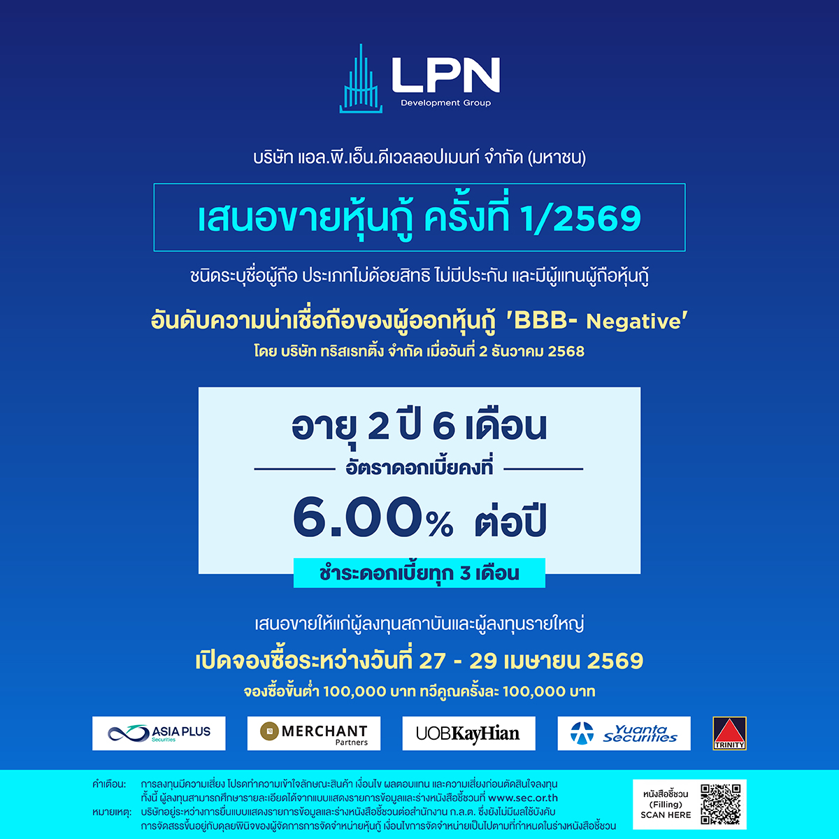 บริษัท แอล.พี.เอ็น. ดีเวลลอปเมนท์ จำกัด (มหาชน) หรือ LPN เตรียมเสนอขายหุ้นกู้ชนิดระบุชื่อผู้ถือ ประเภทไม่ด้อยสิทธิ และไม่มีหลักประกัน อัตราดอกเบี้ยคงที่ 6.00% ต่อปี กำหนดชำระดอกเบี้ยทุก 3 เดือน ระหว่างวันที่ 27 – 29 เมษายน 2569 สำหรับผู้ลงทุนสถาบัน และ/หรือ ผู้ลงทุนรายใหญ่ สร้างทางเลือกการลงทุนในภาวะเศรษฐกิจผันผวน