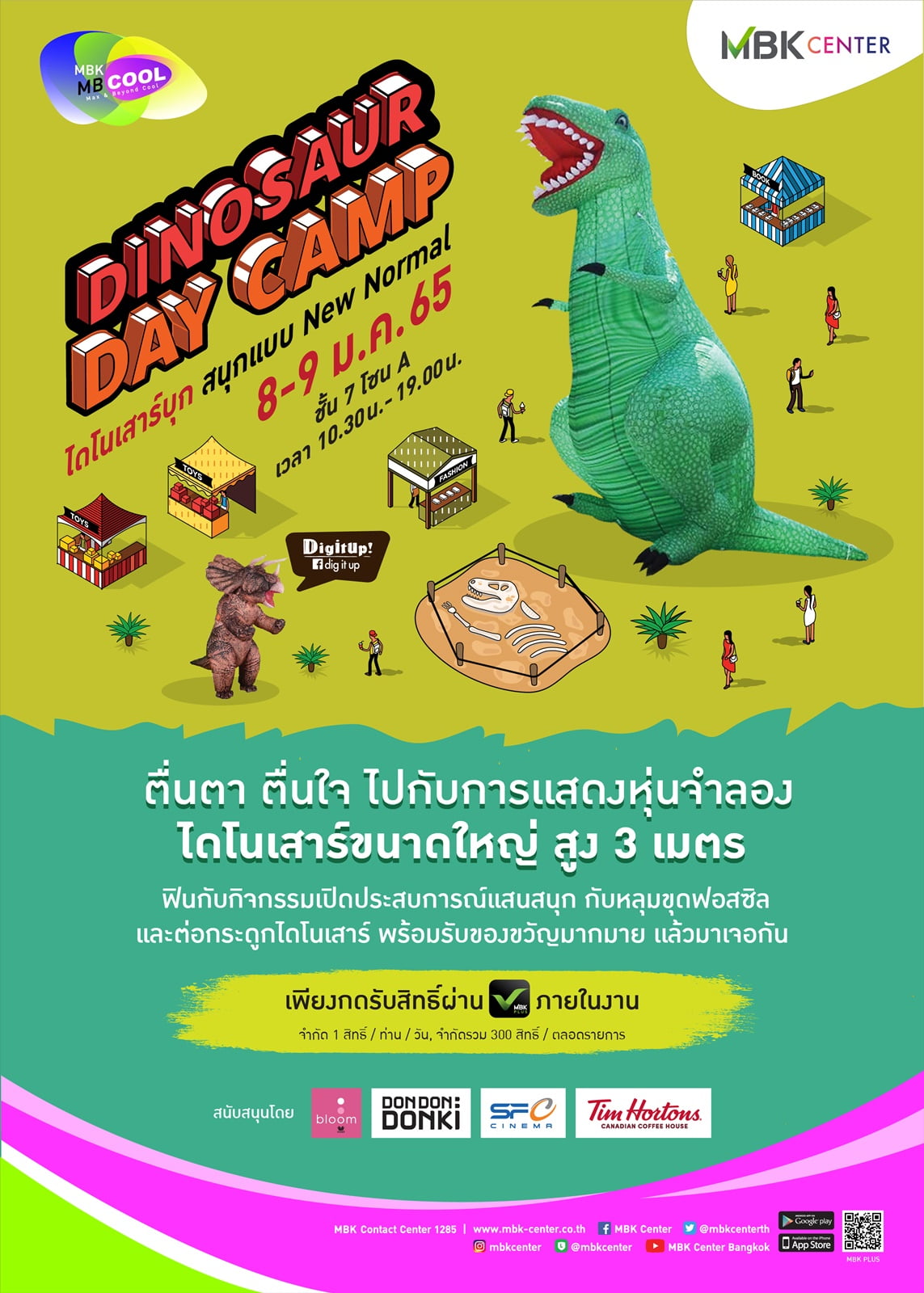 ศูนย์การค้าเอ็ม บี เค เซ็นเตอร์ ชวนน้องๆ มาเปิดประสบการณ์ใหม่ไปกับการสวมบทบาทเป็นนักไดโนเสาร์วิทยา กับกิจกรรม “DINOSAUR DAY CAMP” ในงานน้องๆ จะได้พบกับการเเสดงหุ่นจำลองไดโนเสาร์ขนาดยักษ์ที่มีความสูงถึง 3 เมตร เช่น T-rex, Triceratops, Ankylosaurus และยังมีกิจกรรม Workshop สไตล์แบบ New Normal ที่มาพร้อมความรู้และความสนุกสนานให้กับน้องๆ โดยจะแบ่งออกเป็น 2 ฐานกิจกรรม ได้แก่