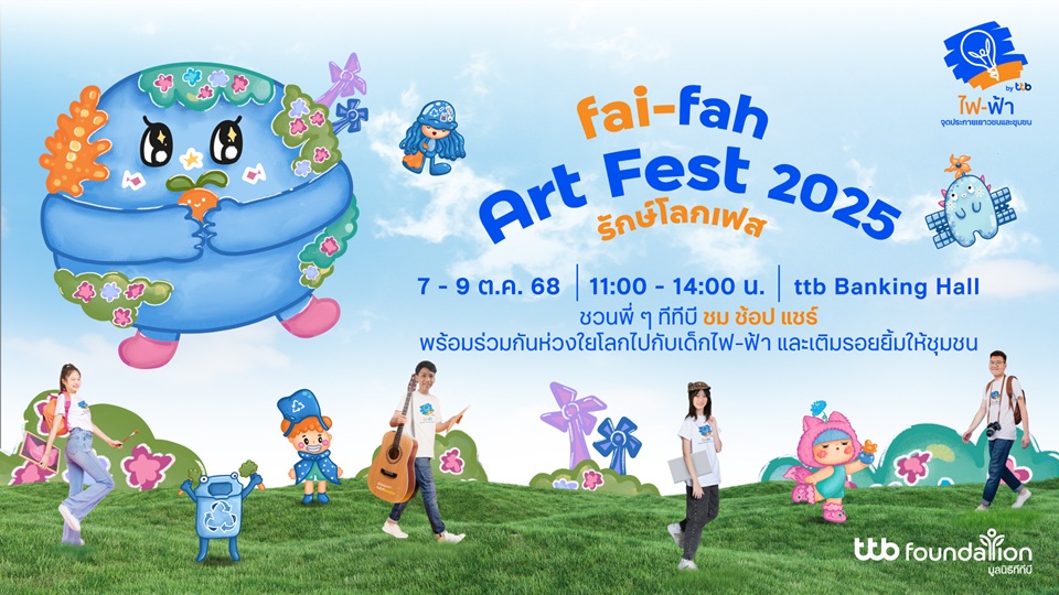 โครงการไฟ-ฟ้า โดยมูลนิธิทีทีบี ชวนรักษ์โลก…แล้วโลกจะกลับมารักเรา พบกิจกรรมที่ดีต่อโลก ดีต่อใจในงาน “fai-fah Art Fest 2025 เด็กธรรมดา คือสิ่งที่สวยงาม” นิทรรศการผลงานศิลปะและการแสดงที่จัดขึ้นต่อเนื่องเป็นปีที่ 16 เพื่อจุดประกายเยาวชนและชุมชน เสริมสร้างสิ่งดี ๆ คืนสู่สังคมไทย โดยเปิดพื้นที่ให้เยาวชนจากศูนย์เรียนรู้ไฟ-ฟ้า ทั้ง 5 แห่ง ได้แก่ ประชาอุทิศ, จันทน์, บางกอกน้อย, สมุทรปราการ และนนทบุรี นำผลงานและผลิตภัณฑ์ที่ได้เรียนรู้ตลอดทั้งปี มาจัดแสดงเป็นนิทรรศการ และจำหน่ายสินค้าที่ผ่านการคิดค้นจากไอเดียสร้างสรรค์ ให้สังคมได้เห็นการเปลี่ยนแปลงของเด็ก ๆ รวมถึงสร้างการมีส่วนร่วมของเด็กไฟ-ฟ้า อาสาสมัครทีทีบีและชุมชน เพื่อเป็นแรงบันดาลใจให้กับพนักงานทีทีบี มุ่งมั่นในการทำกิจกรรม”เปลี่ยน” เพื่อให้สังคมดีขึ้นอย่างยั่งยืน ตอกย้ำปรัชญา Make REAL Change