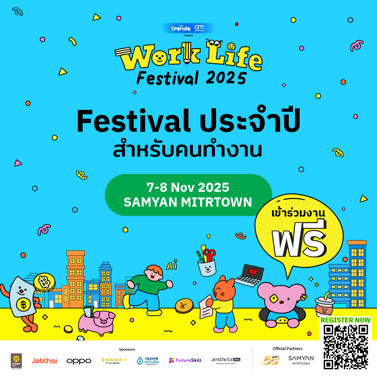 Future Trends และ aomMONEY ผนึกกำลังร่วมกับ ธนาคารกรุงศรีอยุธยา จำกัด (มหาชน), JobThai, OPPO Thailand, ไบแนนซ์ ทีเอช บาย กัลฟ์ ไบแนนซ์ (BINANCE TH), กรุงเทพประกันชีวิต จำกัด (มหาชน), FutureSkill, Aestheta Clinic Wellness and Aesthetic, ตลาดหลักทรัพย์แห่งประเทศไทย, สามย่านมิตรทาวน์, MedPark Hospital, ZipEvent, BeWell และศาลานา จัดงาน ‘WORK LIFE FESTIVAL 2025’ เฟสติวัลเพื่อคนทำงานสุดยิ่งใหญ่แห่งปี รวมทุกมิติของชีวิตการทำงานไว้ครบในที่เดียว ครอบคลุมทั้ง Work, Wealth, Well-being และ We-creation ระหว่างวันที่ 7 – 8 พฤศจิกายน 2568 ณ สามย่านมิตรทาวน์ฮอลล์