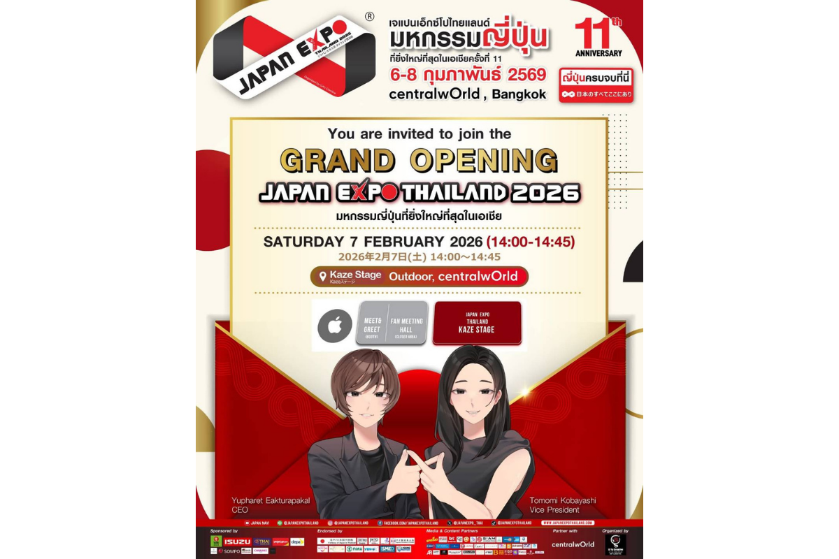 เตรียมนับถอยหลัง กับมหกรรมญี่ปุ่นที่ยิ่งใหญ่ที่สุดในเอเชีย JAPAN EXPO THAILAND 2026 ฉลองครบรอบปีที่ 11 สุดอลังการงานสร้าง ภายใต้ธีม ‘Japan Thai United as One’ โดยความร่วมมือระหว่าง บริษัท จี-ยู ครีเอทีฟ จำกัด และเหล่าพันธมิตรภาครัฐ-เอกชน ที่รวมใจกันจัดงานฉลองอย่างยิ่งใหญ่ให้คุ้มค่าการรอคอย โดยมี บริษัท โออิชิ กรุ๊ป จำกัด (มหาชน), บริษัท ตรีเพชรอีซูซุเซลส์ จํากัด, บริษัท การบินไทย จำกัด (มหาชน), เวียตเจ็ทไทยแลนด์, สำนักงานส่งเสริมเศรษฐกิจดิจิทัล (DEPA), โรงแรม Sivatel, Mainichi Academic Group, บริษัท เอ็ม.เอส. ฮานาโซโน (ประเทศไทย) จำกัด, สถานเอกอัครราชทูตญี่ปุ่นประจำประเทศไทย, องค์การส่งเสริมการค้าต่างประเทศของญี่ปุ่น (JETRO), องค์การส่งเสริมการท่องเที่ยวแห่งประเทศญี่ปุ่น (JNTO), เจแปนฟาวด์เดชั่น, สมาคมญี่ปุ่นในประเทศไทย Japanese Association in Thailand, Amazing Thailand, Thailand Privilege, กรุงเทพมหานคร, YEN-D X, สถาบันพัฒนาวิสาหกิจขนาดกลางและขนาดย่อม (ISMED) และ Young Entrepreneurs Chamber of Commerce (YEC) ร่วมผนึกกำลังจัดงานมหกรรมญี่ปุ่นที่ยิ่งใหญ่ที่สุดในเอเชีย ซึ่งจะจัดขึ้นระหว่างวันศุกร์ที่ 6 – วันอาทิตย์ที่ 8 กุมภาพันธ์ 2569 เวลา 10:00 – 21:00 น. ณ ศูนย์การค้าเซ็นทรัลเวิลด์