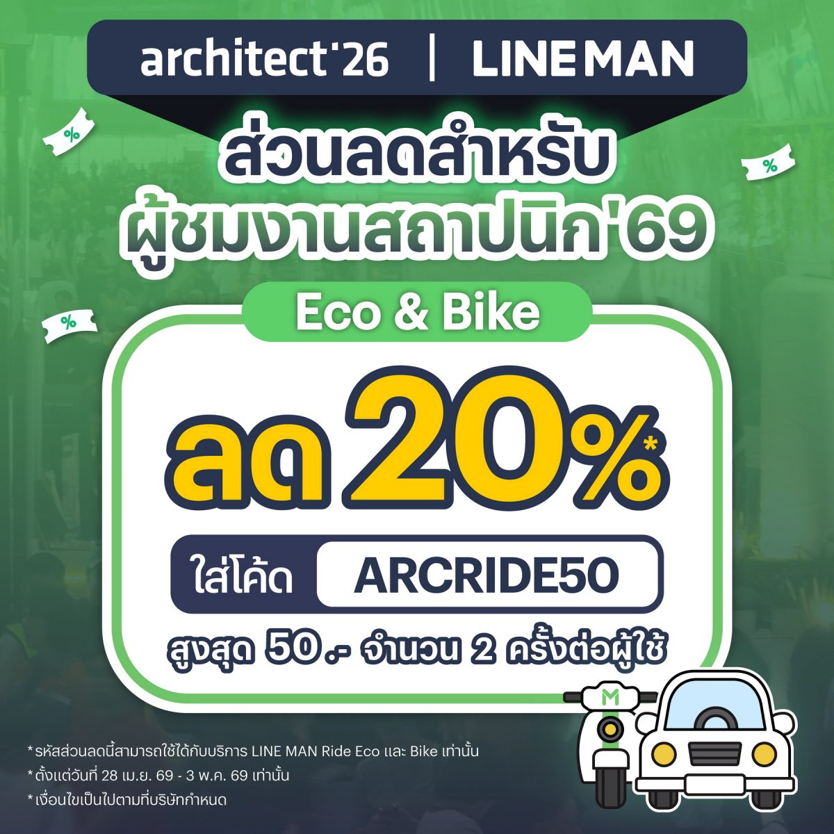 งานสถาปนิก’69 เตรียมมอบสิทธิพิเศษสำหรับผู้เข้าชมงานทั้งด้านการเดินทางและที่พัก เพื่ออำนวยความสะดวกให้ผู้เข้าร่วมงานได้เดินทางและพักผ่อนอย่างสะดวกสบายตลอดช่วงการจัดงาน โดยปีนี้ผู้จัดงานได้ร่วมมือกับพันธมิตรด้านบริการเดินทางและที่พัก ได้แก่ LINE MAN RIDE, Bolt และ TK Palace Hotel & Convention สำหรับ LINE MAN RIDE มอบส่วนลดค่าโดยสาร 20% สำหรับบริการ Eco และ Bike เพียงใส่โค้ด ARCRIDE50 รับส่วนลดสูงสุด 50 บาท จำนวน 2 ครั้งต่อผู้ใช้ ขณะเดียวกัน Bolt มอบส่วนลดพิเศษสำหรับการเดินทางมายังงาน โดยผู้ใช้ใหม่ รับส่วนลด 50% สูงสุด 50 บาท จำนวน 1 ครั้ง เพียงใส่โค้ด ARC2650N1 และสำหรับผู้ใช้ปัจจุบัน รับส่วนลด 30% สูงสุด 50 บาท จำนวน 2 ครั้ง เมื่อใส่โค้ด ARC2630ZE