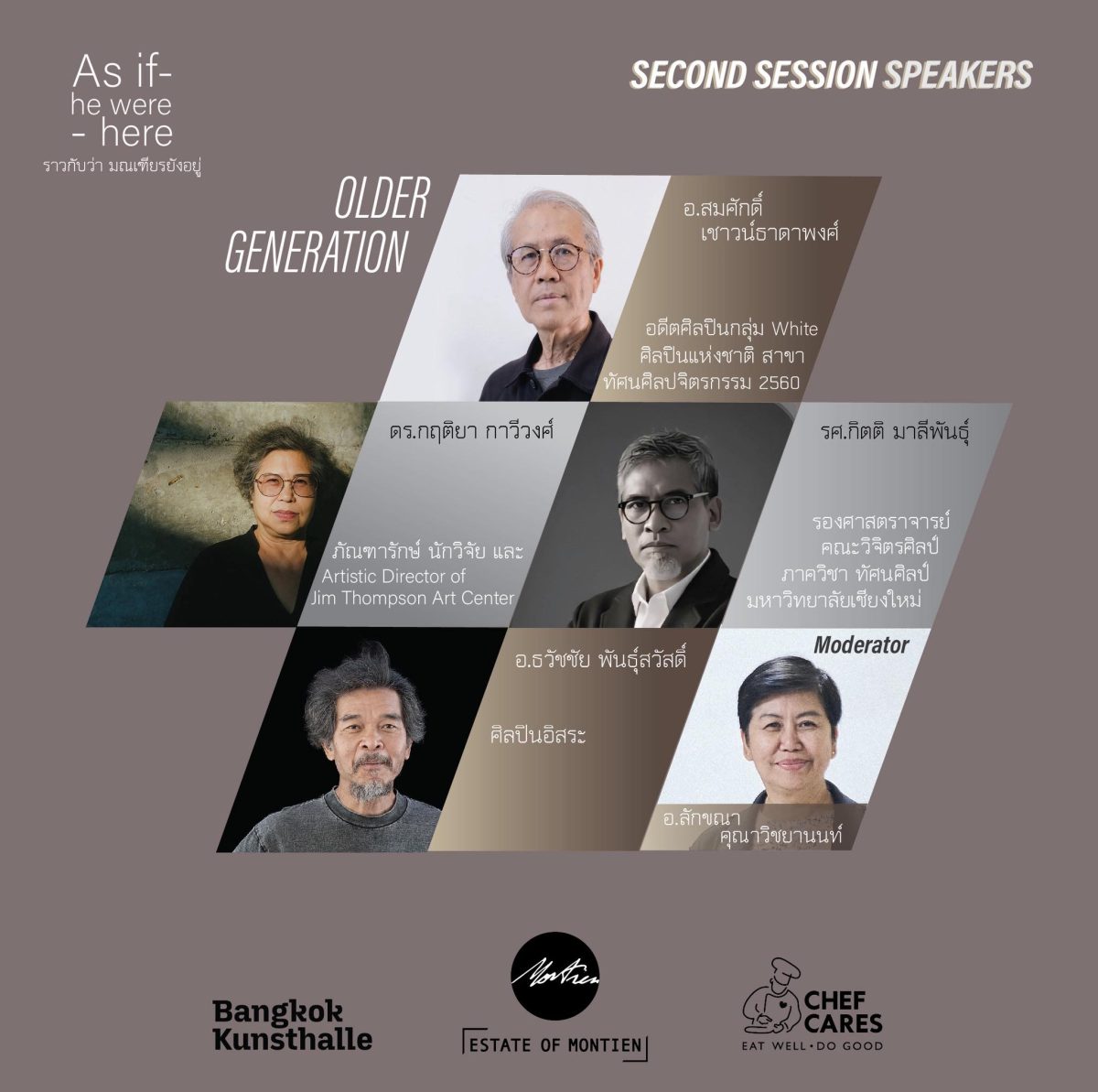 “As If – he were here” เป็นมากกว่างานรำลึกถึงศิลปินผู้ล่วงลับ หากเป็นพื้นที่แห่งบทสนทนาระหว่างอดีตและปัจจุบัน ที่เปิดโอกาสให้ผู้เข้าร่วมงานได้สำรวจอิทธิพลของอาจารย์มณเฑียรที่ยังดำรงอยู่ และนำมาตีความใหม่ในบริบทของศิลปะร่วมสมัย ผ่านเวทีเสวนาที่รวบรวมตัวแทนจากหลายช่วงวัย เพื่อสะท้อนถึงการสืบทอดทางความคิดข้ามกาลเวลา