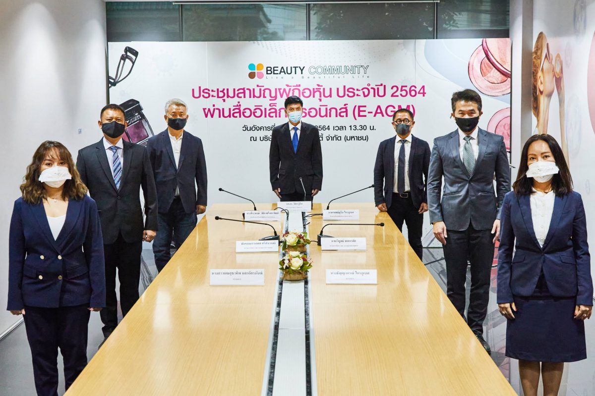 รศ.ดร. วิชิต อู่อ้น (กลาง) ประธานกรรมการ (รักษาการ),ประธานกรรมการตรวจสอบ และกรรมการอิสระ นายแพทย์สุวิน ไกรภูเบศ (ที่ 3 จากขวา) ประธานเจ้าหน้าที่บริหาร ดร.พีระพงษ์ กิตติเวชโภคาวัฒน์ (ที่ 3 จากซ้าย) กรรมการ และนางธัญญาภรณ์ ไกรภูเบศ (ที่ 1 จากขวา ) กรรมการ พร้อมด้วยคณะกรรมการและผู้บริหาร บมจ.บิวตี้ คอมมูนิตี้ (BEAUTY) จัดประชุมสามัญผู้ถือหุ้นผ่านระบบอิเล็กทรอนิกส์ประจำปี 2564 (E-AGM) โดยที่ประชุมมีมติรับรองรายงานคณะกรรมการบริษัทสำหรับผลการดำเนินงานประจำปี 2563 และรายงานประจำปี 2563 ณ สำนักงานใหญ่ บมจ.บิวตี้คอมมูนิตี้ ถ.นวลจันทร์