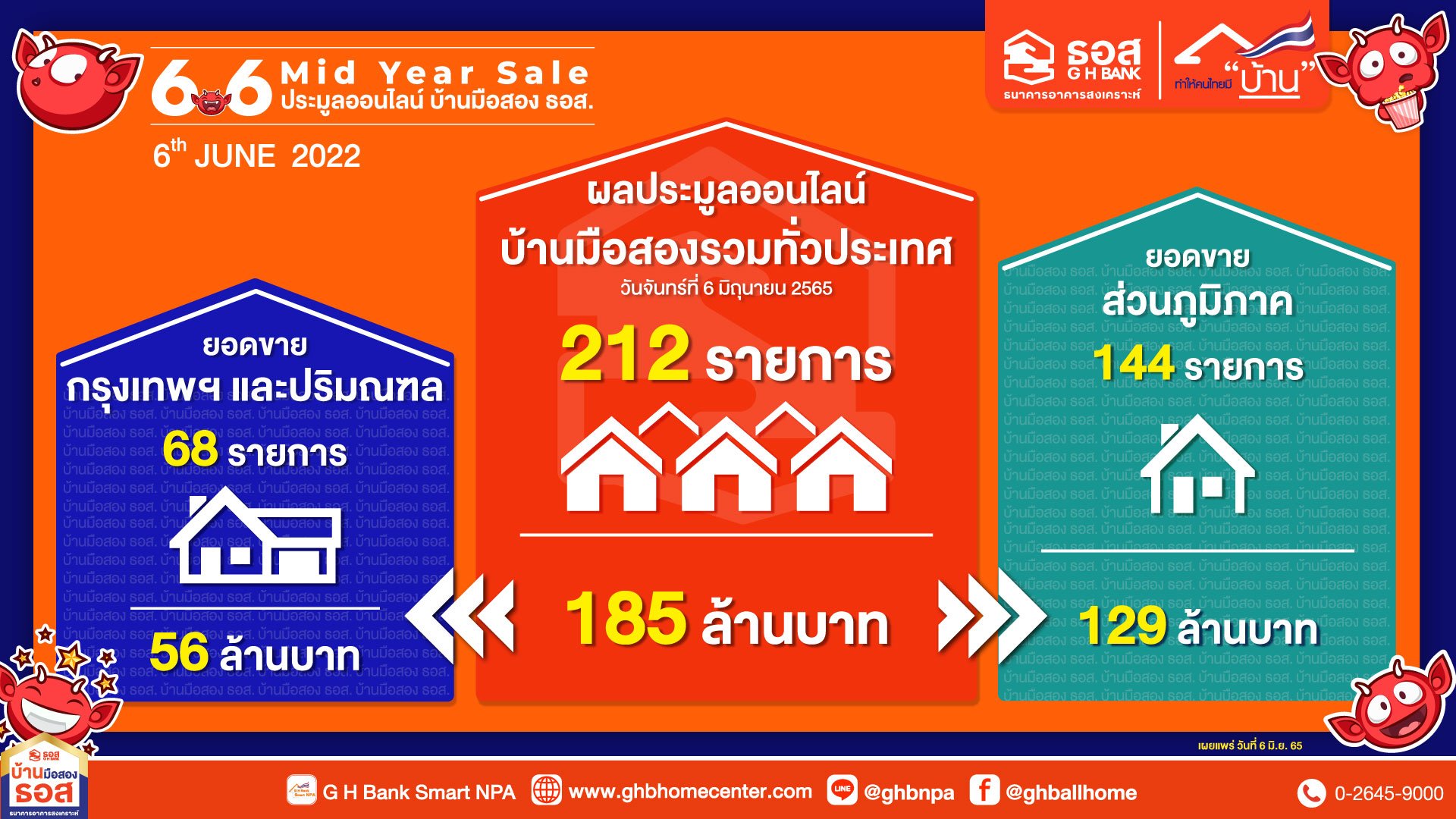 ธนาคารอาคารสงเคราะห์ (ธอส.) รายงานผลการจัดงาน “6.6 Mid Year Sale ประมูลบ้านมือสอง ธอส. ออนไลน์” ผ่าน Application : G H Bank Smart NPA ที่จัดขึ้นในวันจันทร์ที่ 6 มิถุนายน 2565 ระหว่างเวลา 12.00-13.00 น. สามารถจำหน่ายบ้านมือสองได้จำนวน 212 รายการ คิดเป็นมูลค่ารวม 185 ล้านบาท แบ่งเป็นบ้านมือสองที่ตั้งอยู่ในพื้นที่กรุงเทพฯ และปริมณฑล จำนวน 68 รายการ และในส่วนภูมิภาค 144 รายการ โดยรายการที่ประมูลขายได้ในราคาถูกที่สุด คือ ห้องชุด ชั้นที่ 4 จาก 4 ชั้น ขนาดเนื้อที่ 26.25 ตารางเมตร ในโครงการปลาทอง 79 อ.เมืองปทุมธานี จ.ปทุมธานี จำหน่ายได้ในราคาตั้งต้นประมูลที่เพียง 35,000 บาทเท่านั้น ส่วนรายการที่ประมูลขายได้ในราคาสูงสุดที่ราคา 2,500,000 บาท มีจำนวน 2 รายการ คือ บ้านเดี่ยว 1 ชั้น ขนาด 77 ตารางวา ในโครงการกลางเมืองบายพาส อ.เมืองชุมพร จ.ชุมพร และอาคารพาณิชย์ 3 ชั้น ขนาด 14 ตารางวา ในอำเภออุทัย จังหวัดพระนครศรีอยุธยา