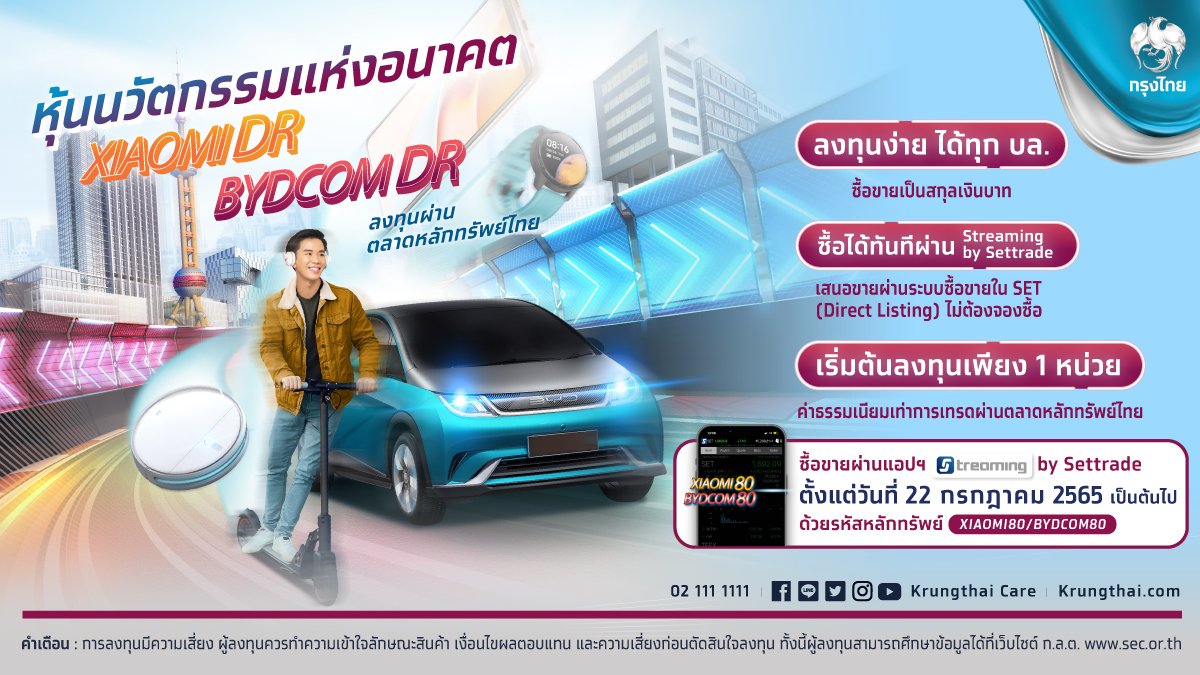 ธนาคารกรุงไทย ตอบรับกระแสลงทุน DR หุ้นจีนดีเกินคาด จ่อคิวเสนอขาย DR อ้างอิงหุ้นจีนยักษ์ใหญ่ระดับโลก 2 บริษัท “Xiaomi” และ “BYD” ประเดิมรูปแบบ Direct listing เพิ่มทางเลือกนักลงทุน เสริมความมั่นคงของพอร์ต ตอบโจทย์ความต้องการลูกค้าครบวงจร พร้อมเทรดผ่าน SET 22 ก.ค.นี้