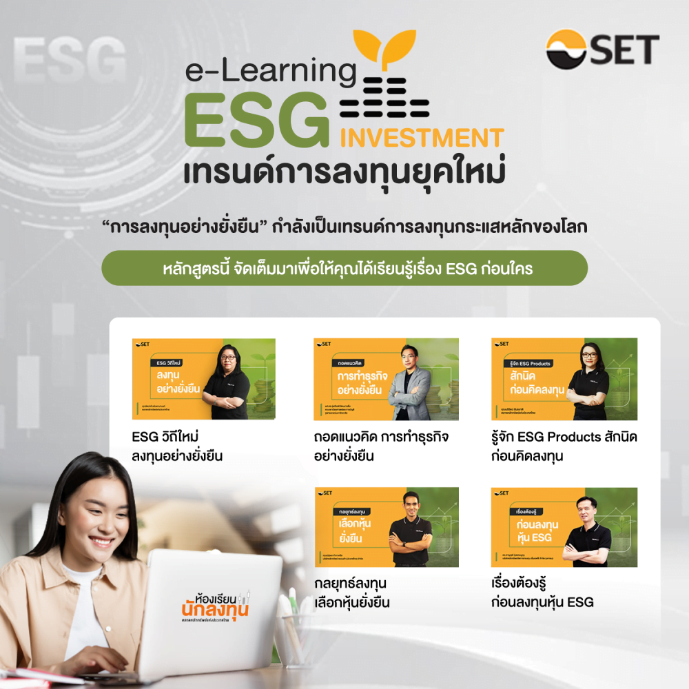 ตลาดหลักทรัพย์แห่งประเทศไทย ชวนผู้ลงทุนเรียนรู้เทรนด์การลงทุนอย่างยั่นยืนซึ่งกำลังเป็นเทรนด์การลงทุนกระแสหลักของโลกและเป็นเทรนด์การลงทุนระยะยาว จัดเต็ม 7 หลักสูตร SET e-Learning “ESG Investment” เรียนรู้ตั้งแต่แนวคิดการลงทุน ผลิตภัณฑ์ที่มีให้เลือกลงทุน ตลอดจนกลยุทธ์การลงทุน รวมถึงการนำข้อมูลมาวิเคราะห์เพื่อตัดสินใจลงทุน ได้แก่ หลักสูตร “รอบรู้ลงทุนหุ้น ESG ฉบับมือใหม่”, “ESG วิถีใหม่ ลงทุนอย่างยั่งยืน”, “ถอดแนวคิดการทำธุรกิจอย่างยั่งยืน”, “รู้จัก ESG Products สักนิด ก่อนคิดลงทุน”, “กลยุทธ์ลงทุน เลือกหุ้นยั่งยืน”, “เรื่องต้องรู้ก่อนลงทุนหุ้น ESG” และ “มือใหม่หัดเลือกหุ้น ESG เข้าพอร์ต” เรียนฟรี จบแล้วได้ e-Certificate ที่ SET e-Learning https://setga.page.link/Jra4cX4vTwL8FyoB6