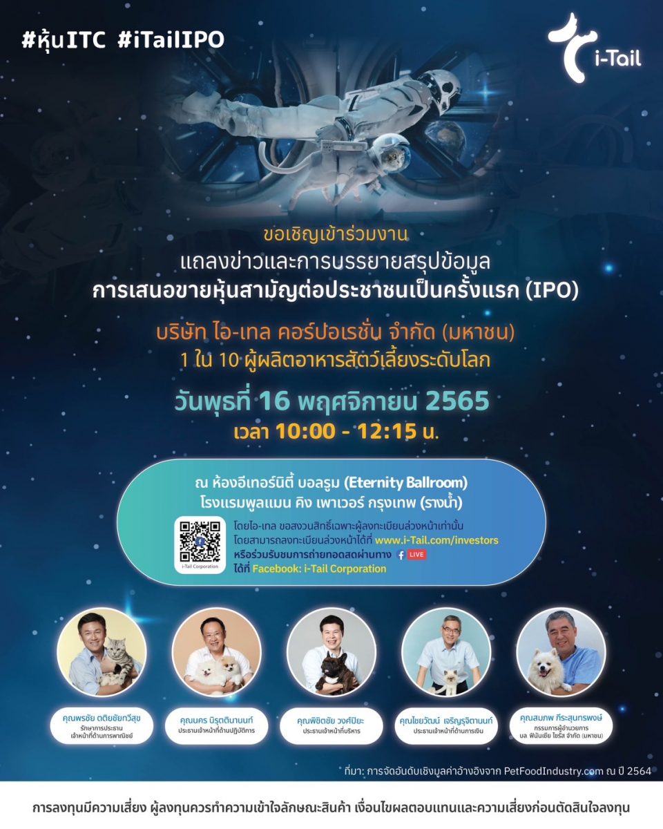 บริษัท ไอ-เทล คอร์ปอเรชั่น จำกัด (มหาชน) หรือ ITC ผู้นำธุรกิจผลิตอาหารสัตว์เลี้ยงครบวงจร ขอเชิญนักลงทุนและผู้สนใจร่วมฟังการบรรยายสรุปข้อมูลการเสนอขายหุ้นสามัญต่อประชาชนเป็นครั้งแรก (IPO) นำโดยนายพิชิตชัย วงศ์ปิยะ ประธานเจ้าหน้าที่บริหาร พร้อมคณะผู้บริหารจาก ไอ-เทล และนายสมภพ กีระสุนทรพงษ์ กรรมการผู้อำนวยการ บริษัทหลักทรัพย์ ฟินันเซีย ไซรัส จำกัด (มหาชน) พร้อมชมนวัตกรรมและสัมผัสกับน้องหมาน้องแมวใน i-Cattery และ Dog Park ในวันพุธที่ 16 พฤศจิกายน 2565 เวลา 10:00 – 12:15 น. ณ ห้องอีเทอร์นิตี้ บอลรูม โรงแรมพูลแมน คิง เพาเวอร์ กรุงเทพ (รางน้ำ) สนใจลงทะเบียนล่วงหน้าได้ที่ www.i-Tail.com/investors (สงวนสิทธิ์เฉพาะผู้ลงทะเบียนล่วงหน้าเท่านั้น) หรือรับชมการถ่ายทอดสดผ่านทาง Facebook LIVE ได้ที่ Facebook: i-Tail Corporation