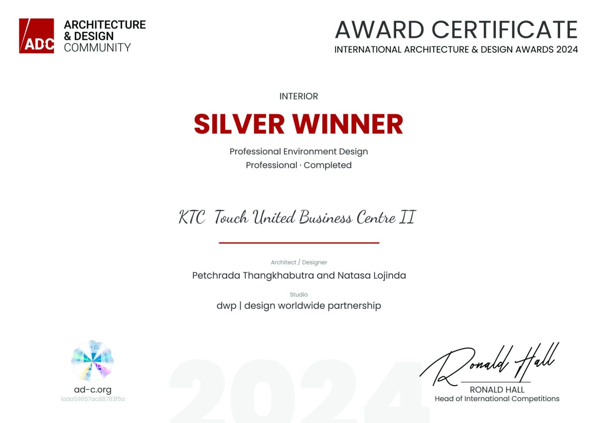 ”เคทีซี ทัช” สำนักงานใหญ่ ได้รับรางวัล “Silver Winner of The International Architecture & Design Awards 2024” จากหน่วยงาน Architecture & Design Community โดยพิจารณาจากงานออกแบบสถาปัตยกรรมสมัยใหม่ทั่วโลก ภายใต้เกณฑ์การพิจารณาที่สามารถตอบโจทย์การประสานความเป็นอยู่ที่ดีของมนุษย์และสิ่งแวดล้อม การบูรณาการเทคโนโลยีเข้ากับการออกแบบ เพื่อยกระดับคุณภาพชีวิต