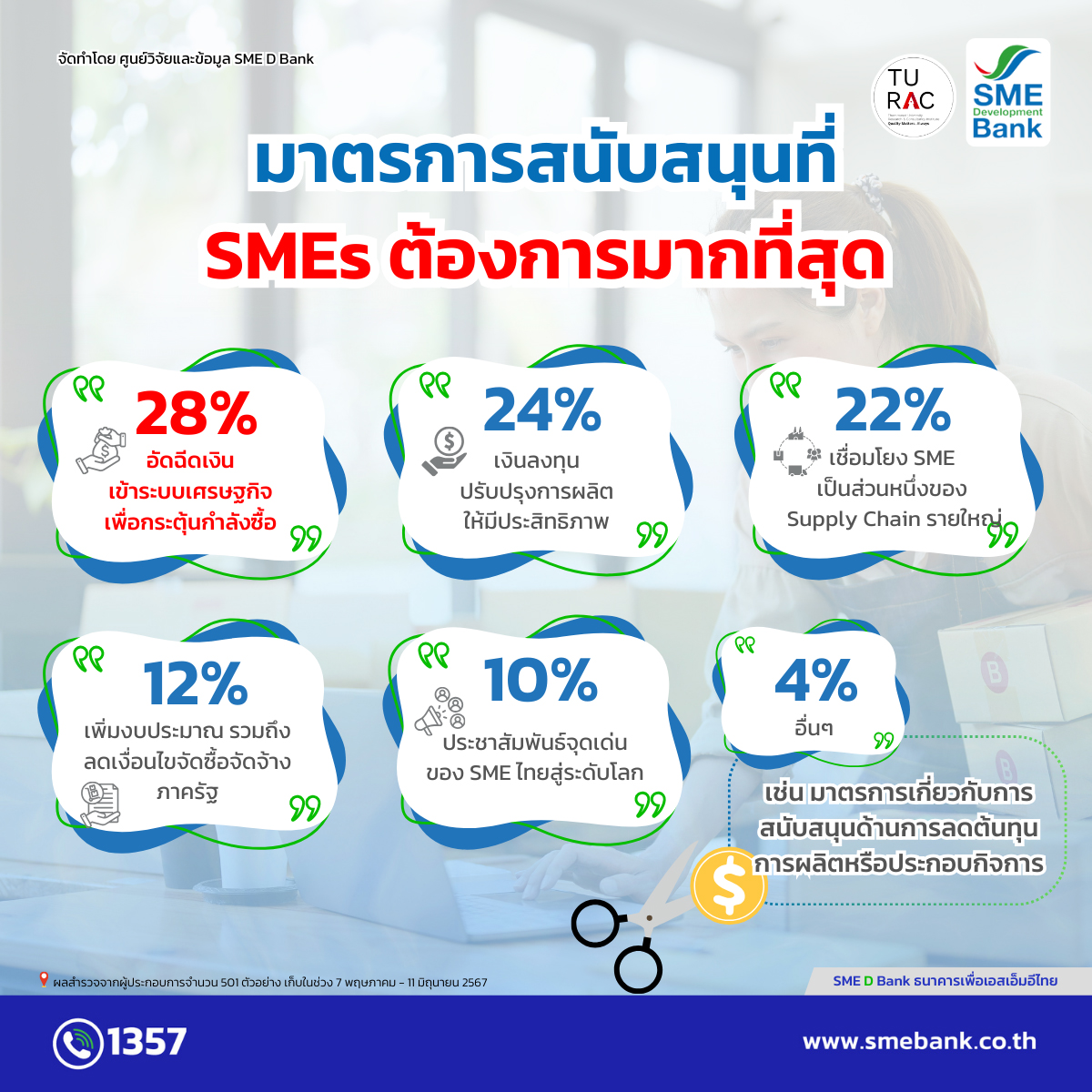 ควบคู่กับให้บริการด้านการพัฒนาเสริมแกร่งธุรกิจ ฟรี ผ่านแพลตฟอร์ม “DX” by SME D Bank (dx.smebank.co.th) ที่รวบรวมการสนับสนุนผู้ประกอบการเอสเอ็มอีครบถ้วนในจุดเดียว เช่น Business Health Check ระบบตรวจประเมินสุขภาพธุรกิจ E-Learning รวบรวมหลักสูตรความรู้สำคัญ ที่ปรึกษาและให้คำแนะนำธุรกิจจากโค้ชมืออาชีพ ระบบจองเข้าร่วมกิจกรรมเติมความรู้ต่อเนื่องตลอดทั้งปี และสิทธิประโยชน์พิเศษอื่นๆ อีกมากมาย สามารถแจ้งความประสงค์รับบริการ ทั้งด้านการเงินและการพัฒนาได้ผ่านช่องทางต่าง ๆ เช่น LINE Official Account : SME Development Bank เว็บไซต์ www.smebank.co.th และสาขาของ SME D Bank ทั่วประเทศ เป็นต้น สอบถามข้อมูลเพิ่มเติม Call Center 1357