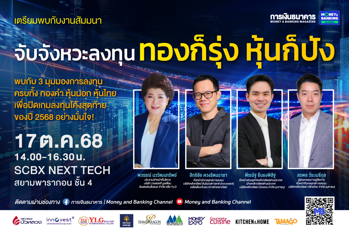 วารสารการเงินธนาคาร เตรียมจัดสัมมนาเศรษฐกิจและการลงทุนครั้งยิ่งใหญ่ หัวข้อ “จับจังหวะลงทุน : ทองก็รุ่ง หุ้นก็ปัง” ในวันศุกร์ที่ 17 ตุลาคม 2568 เวลา 14.00-16.30 น. ณ SCBX Next Tech ชั้น 4 ศูนย์การค้าสยามพารากอน เพื่อเปิดเวทีแลกเปลี่ยนมุมมองและกลยุทธ์การลงทุน ท่ามกลางความท้าทายของเศรษฐกิจโลก ที่กำลังเผชิญความไม่แน่นอนจากหลายปัจจัย ทั้งผลกระทบจากภาษีนำเข้าสหรัฐอเมริกา (Reciprocal Tariff) การชะลอตัวของเศรษฐกิจโลก ทิศทางการดำเนินนโยบายการเงินของธนาคารกลางทั่วโลกแตกต่างกันตามบริบทของเงินเฟ้อและเศรษฐกิจในแต่ละประเทศ ความตึงเครียดทางภูมิรัฐศาสตร์ ที่ส่งผลกระทบต่อตลาดเงินและตลาดทุนทั่วโลกให้มีความผันผวน