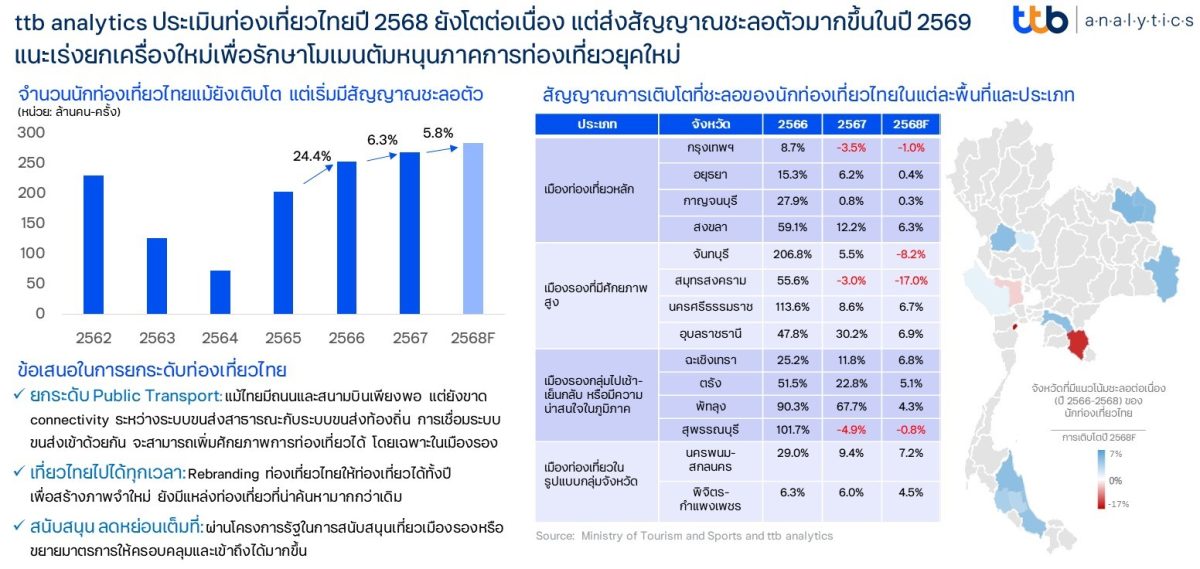 การท่องเที่ยวในประเทศของนักท่องเที่ยวไทยในช่วง 2-3 ปีที่ผ่านมานับเป็นยุคทองของการท่องเที่ยว จากอานิสงส์ของโครงสร้างอายุของประชากรวัยท่องเที่ยว (25 ปี – 65 ปี) ที่นับว่ายังสามารถส่งผลบวกให้กับภาคการท่องเที่ยวในประเทศได้เป็นอย่างดี แต่อย่างไรก็ตาม สัญญาณการท่องเที่ยวที่เคยเป็นจุดหนุนทั้งในรูปแบบ 1) กลุ่มเมืองท่องเที่ยวหลักในแต่ละภูมิภาคที่ปกติมีนักท่องเที่ยวเกินกว่า 4 ล้านคน / ครั้ง / ต่อปี เช่น จังหวัดพระนครศรีอยุธยา ปี 2566 เติบโตดีที่ 15.3% แต่เริ่มชะลอในปี 2567 ที่ 6.2% และปี 2568 การเติบโตของนักท่องเที่ยวกลับเหลือเพียง 0.4% หรือเมืองหลักในภูมิภาคอื่น ๆ อาทิ สงขลาเติบโต 59.1% ในปี 2566 และเริ่มชะลอลง 12.2% และ 6.3% ในปี 2567 และ 2568 ตามลำดับ 2) กลุ่มเมืองรองที่มีศักยภาพสูงเพียงพอดึงดูดให้พักค้างแรม เช่น จังหวัดจันทบุรี ปี 2566 เติบโตถึง 206.8% และค่อย ๆ ชะลอลงเหลือ 5.5% ในปี 2567 จนปี 2568 หดตัวลง -8.2% หรือจังหวัดสมุทรสงครามเติบโต 55.6% ในปี 2566 แต่กลับหดตัวลงต่อเนื่อง -3.0% และ -17.0% ในปี 2567 และ 2568 ตามลำดับ 3) เมืองรองกลุ่มไปเช้า-เย็นกลับอาทิ จังหวัดฉะเชิงเทรา ในปี 2566 เติบโต 25.2% ในปี 2567 เริ่มชะลอตัวลงเหลือ 11.8% และปัจจุบันเหลือ 6.8% หรือกลุ่มจังหวัดที่พัฒนาแหล่งท่องเที่ยวที่น่าสนใจสำหรับนักท่องเที่ยวในภูมิภาค เช่น จังหวัดตรังที่ในปี 2566 เติบโต 51.5% แต่ค่อย ๆ ชะลอลงเหลือ 22.8% และ 5.1% ในปี 2567 และ 2568 ตามลำดับ และ 4) การท่องเที่ยวในรูปแบบกลุ่มจังหวัดที่มีเขตพื้นที่ติดต่อกันเสริมศักยภาพการท่องเที่ยวซึ่งกันและกัน เช่น นครพนม-สกลนคร ปี 2566 เติบโต 29.0% และเริ่มชะลอตัวลงในปี 2567 และ 2568 ที่เติบโต 9.4% และ 7.2% ตามลำดับ